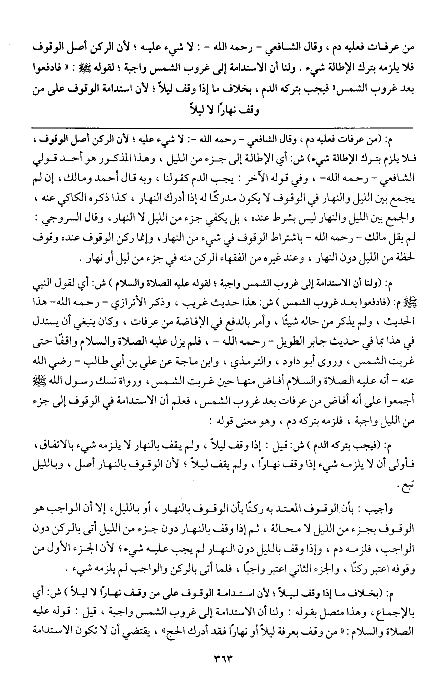 من عرفات فعليه دم، وقال الشافعي - رَحِمَهُ اللَّهُ -: لا شيء عليه؛ لأن الركن أصل الوقوف فلا يلزمه بترك الإطالة شيء. ولنا أن الاستدامة إلى غروب الشمس واجبة لقوله - صَلَّى اللَّهُ عَلَيْهِ وَسَلَّمَ -: «فادفعوا بعد غروب الشمس» فيجب بتركه الدم، بخلاف ما إذا وقف ليلا لأن استدامة الوقوف على من وقف نهارا لا ليلا