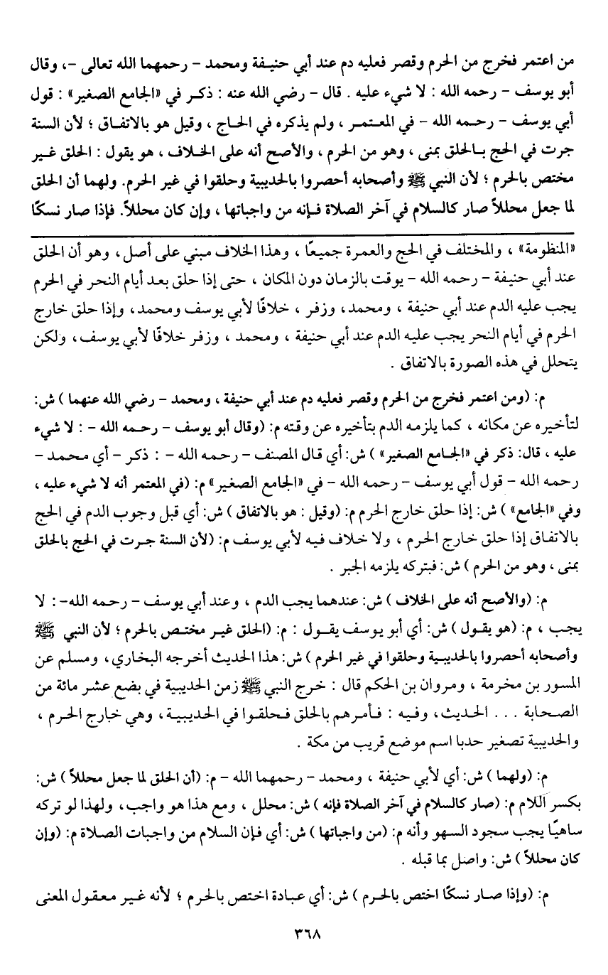 ـــــــــــــــــــــــــــــQ" المنظومة "، والمختلف في الحج والعمرة جميعاً، وهذا الخلاف مبنى على أصل، وهو أن الحلق عند أبي حنيفة - رَحِمَهُ اللَّهُ - يوقت بالزمان دون المكان، حتى إذا حلق بعد أيام النحر في الحرم يجب عليه الدم عند أبي حنيفة، ومحمد، وزفر، خلافاً لأبي يوسف ومحمد، وإذا حلق خارج الحرم في أيام النحر يجب عليه الدم عند أبي حنيفة، ومحمد، وزفر خلافاً لأبي يوسف، ولكن يتحلل في هذه الصورة بالاتفاق.