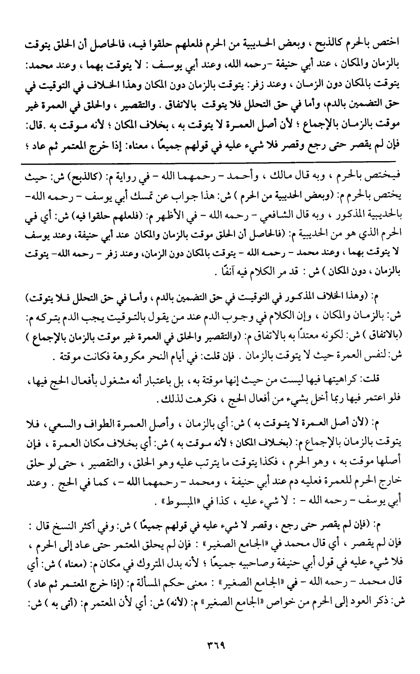 اختص بالحرم كالذبح، وبعض الحديبية من الحرم فلعلهم حلقوا فيه، فالحاصل أن الحلق يتوقت بالزمان والمكان، عند أبي حنيفة - رَحِمَهُ اللَّهُ - وعند أبي يوسف: لا يتوقت بهما، وعند محمد: يتوقت بالمكان دون الزمان، وعند زفر: يتوقت بالزمان دون المكان. وهذا الخلاف في التوقيت في حق التضمين بالدم، وأما في حق التحلل فلا يتوقت بالاتفاق. والتقصير، والحلق في العمرة غير موقت بالزمان بالإجماع؛ لأن أصل العمرة لا يتوقت به، بخلاف المكان؛ لأنه موقت به. قال: فإن لم يقصر حتى رجع وقصر فلا شيء عليه في قولهم جميعا، معناه: إذا خرج المعتمر ثم عاد؛