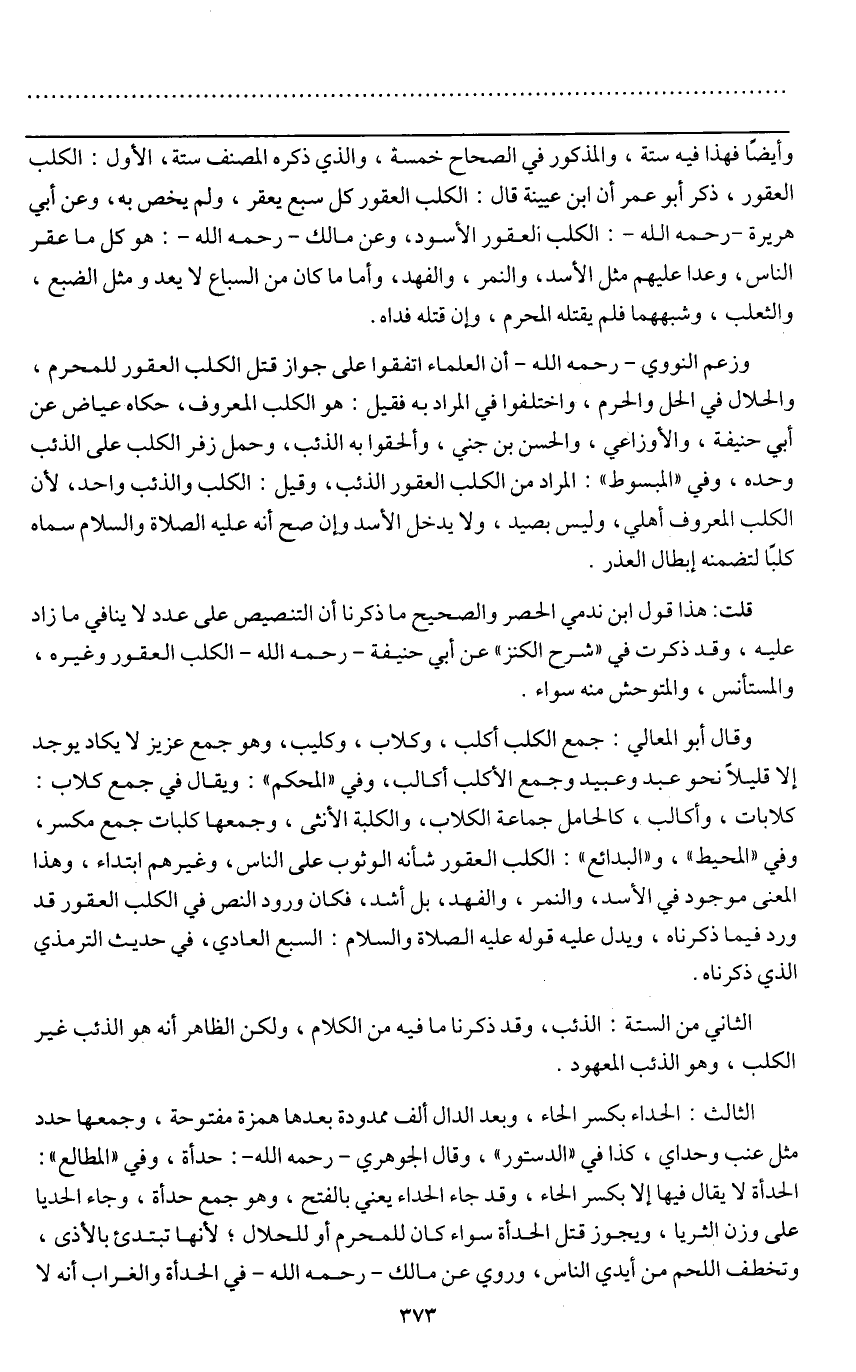وقال أبو المعالي: جمع الكلب أكلب، وكلاب، وكليب، وهو جمع عزيز لا يكاد يوجد إلا قليلاً نحو عبد وعبيد وجمع الأكلب أكالب، وفي " المحكم ": ويقال في جمع كلاب: كلابات، وأكالب، كالحامل جماعة الكلاب، والكلبة الأنثى، وجمعها كلبات جمع مكسر، وفي " المحيط "، و " البدائع ": الكلب العقور شأنه الوثوب على الناس، وغيرهم ابتداء، وهذا المعنى موجود في الأسد، والنمر، والفهد، بل أشد، فكان ورود النص في الكلب العقور قد ورد فيما ذكرناه، ويدل عليه قوله - عَلَيْهِ الصَّلَاةُ وَالسَّلَامُ -: «السبع العادي» في حديث الترمذي الذي ذكرناه.