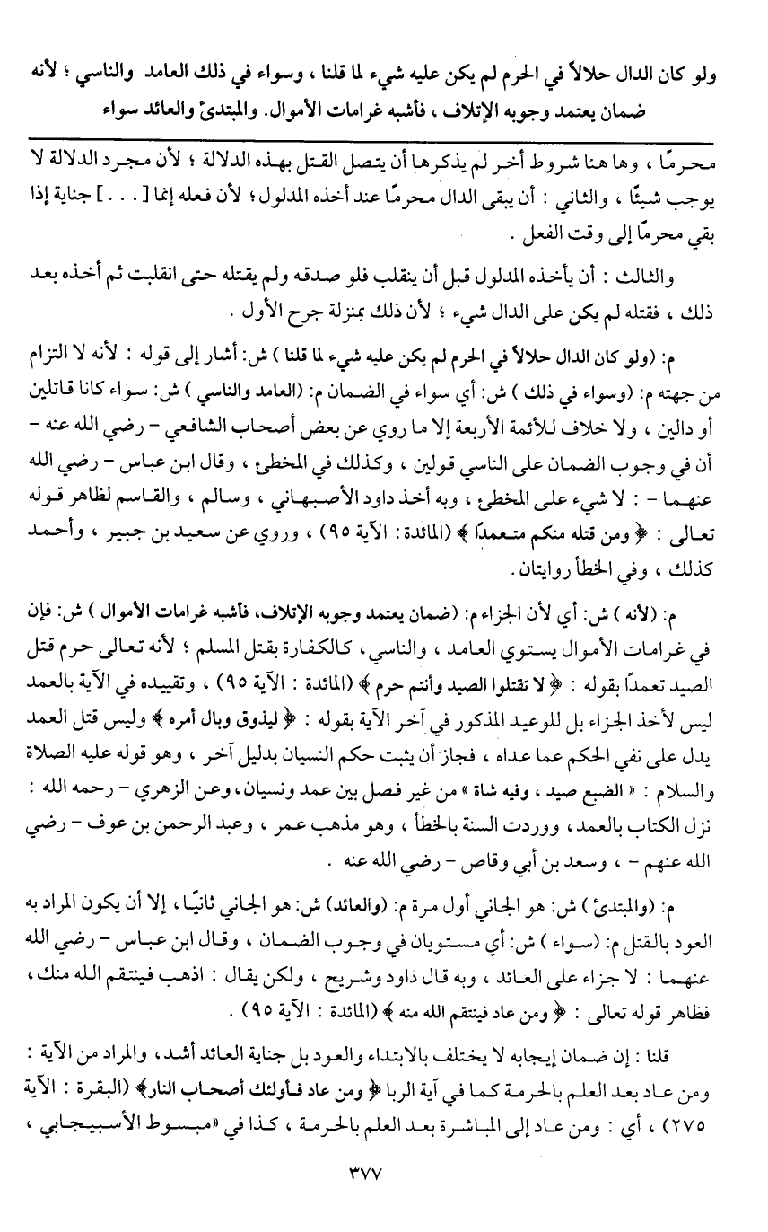 ولو كان الدال حلالا في الحرم لم يكن عليه شيء لما قلنا، وسواء في ذلك العامد والناسي؛ لأنه ضمان يعتمد وجوبه الإتلاف، فأشبه غرامات الأموال. والمبتدئ والعائد سواء