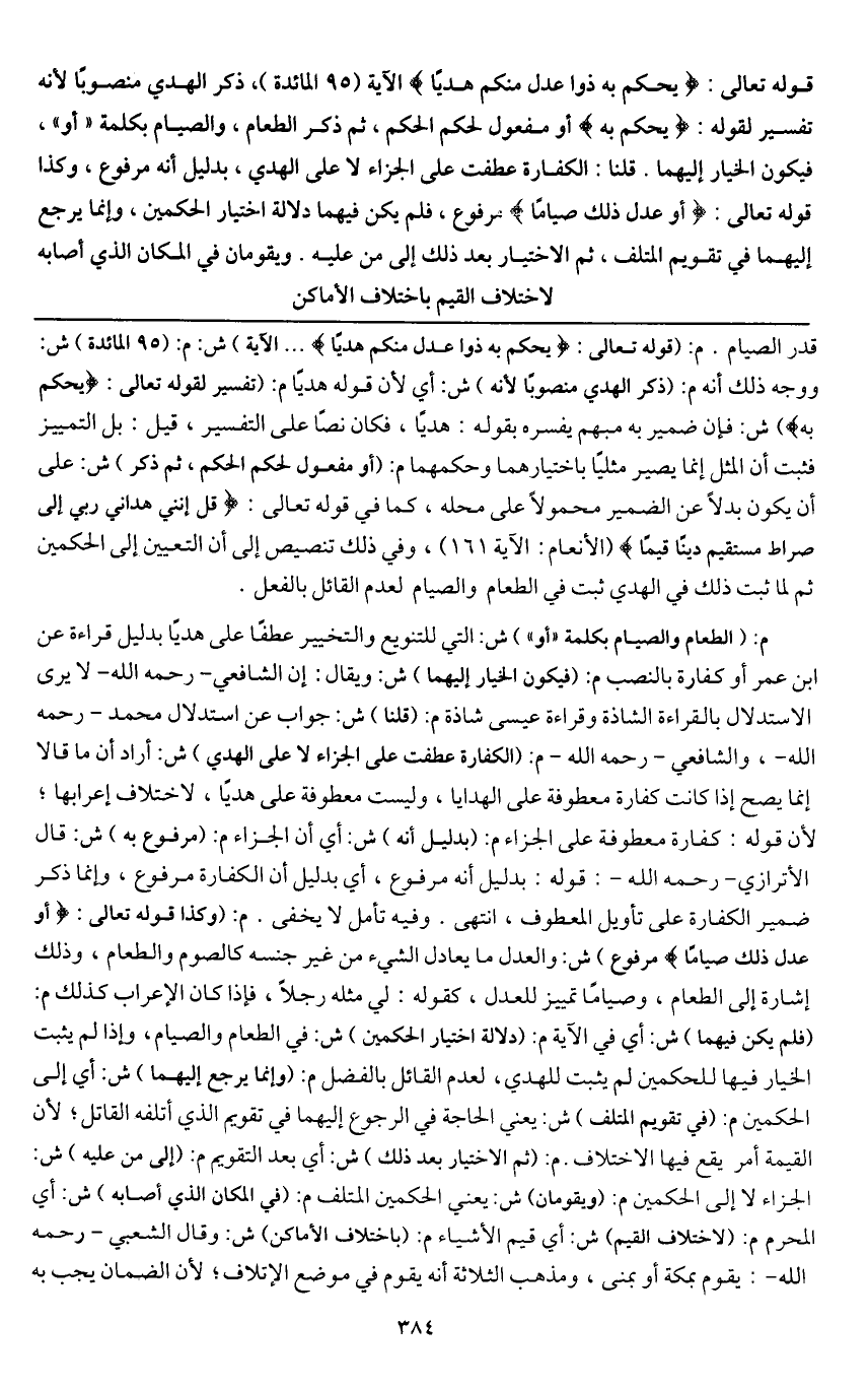 قَوْله تَعَالَى: {يَحْكُمُ بِهِ ذَوَا عَدْلٍ مِنْكُمْ هَدْيًا} [المائدة: 95] الآية (95 المائدة) ذكر الهدي منصوبا لأنه تفسير لِقَوْلِهِ تَعَالَى {يَحْكُمُ بِهِ} [المائدة: 95] أو مفعول لحكم الحكم، ثم ذكر الطعام، والصيام بكلمة " أو "، فيكون الخيار إليهما. قلنا: الكفارة عطفت على الجزاء لا على الهدي بدليل أنه مرفوع، وكذا قَوْله تَعَالَى: {أَوْ عَدْلُ ذَلِكَ صِيَامًا} [المائدة: 95] مرفوع، فلم يكن فيها دلالة اختيار الحكمين، وإنما يرجع إليهما في تقويم المتلف , ثم الاختيار بعد ذلك إلى من عليه، ويقومان في المكان الذي أصابه لاختلاف القيم باختلاف الأماكن
