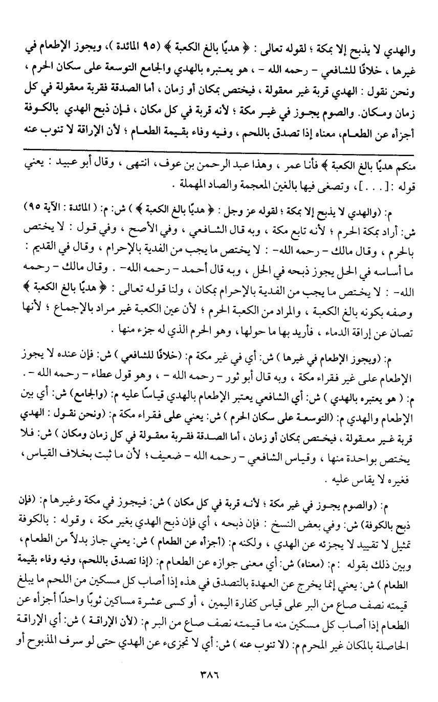 م: (والهدي لا يذبح إلا بمكة؛ لقوله عز وجل: {هَدْيًا بَالِغَ الْكَعْبَةِ} [المائدة: 95] ش: م: (المائدة: الآية 95)) ش: أراد بمكة الحرم؛ لأنه تابع مكة، وبه قال الشافعي، وفي الأصح، وفي قول: لا يختص بالحرم، وقال مالك - رَحِمَهُ اللَّهُ -: لا يختص ما يجب من الفدية بالإحرام، وقال في القديم: ما أساسه في الحل يجوز ذبحه في الحل، وبه قال أحمد - رَحِمَهُ اللَّهُ -، وقال مالك - رَحِمَهُ اللَّهُ -: لا يختص ما يجب من الفدية بالإحرام بمكان، ولنا قَوْله تَعَالَى: {هَدْيًا بَالِغَ الْكَعْبَةِ} [المائدة: 95] وصفه بكونه بالغ الكعبة، والمراد من الكعبة الحرام؛ لأن عين الكعبة غير مراد بالإجماع؛ لأنها تصان عن إراقة الدماء، فأريد بها ما حولها، وهو الحرم الذي له جزء منها.