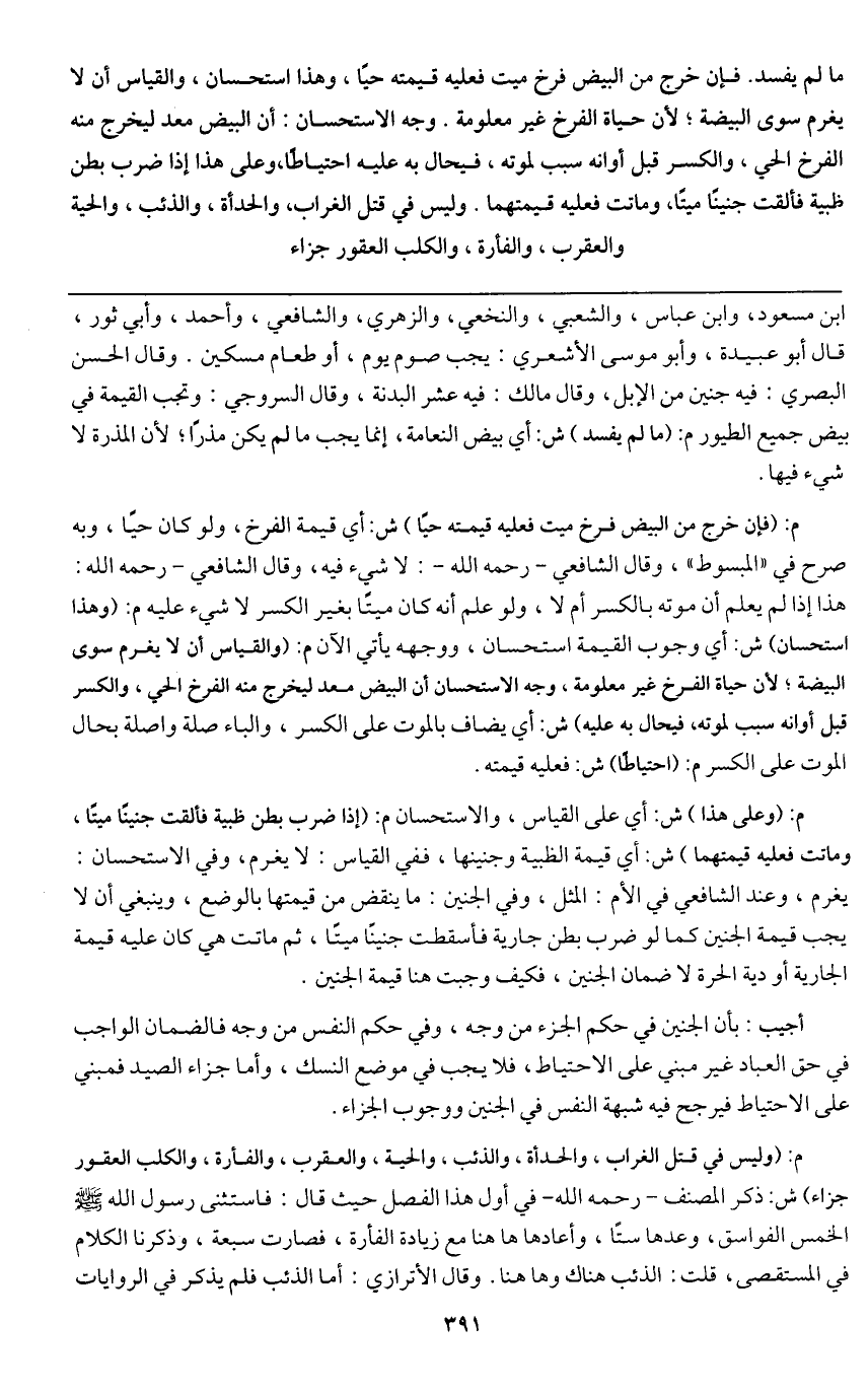 فإن خرج من البيض فرخ ميت فعليه قيمته حيا، وهذا استحسان، والقياس أن لا يغرم سوى البيضة؛ لأن حياة الفرخ غير معلومة. وجه الاستحسان أن البيض معد؛ ليخرج منه الفرخ الحي، والكسر قبل أوانه سبب لموته فيحال به عليه احتياطا، وعلى هذا إذا ضرب بطن ظبية فألقت جنينا ميتا وماتت فعليه قيمتهما. وليس في قتل الغراب، والحدأة، والذئب، والحية، والعقرب، والفأرة، والكلب العقور جزاء؛