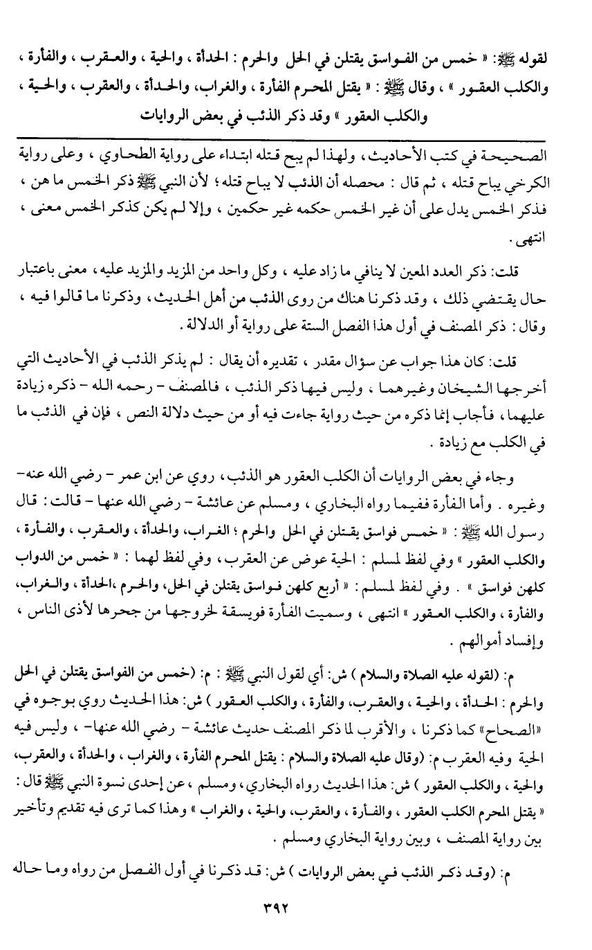 ـــــــــــــــــــــــــــــQالصحيحة في كتب الأحاديث، ولهذا لم يبح قتله ابتداء على رواية الطحاوي، وعلى رواية الكرخي يباح قتله، ثم قال: محصله أن الذئب لا يباح قتله؛ لأن النبي - صَلَّى اللَّهُ عَلَيْهِ وَسَلَّمَ - ذكر الخمس ما هن، فذكر الخمس يدل على أن غير الخمس حكمه غير حكمها، وإلا لم يكن لذكر الخمس معنى، انتهى.