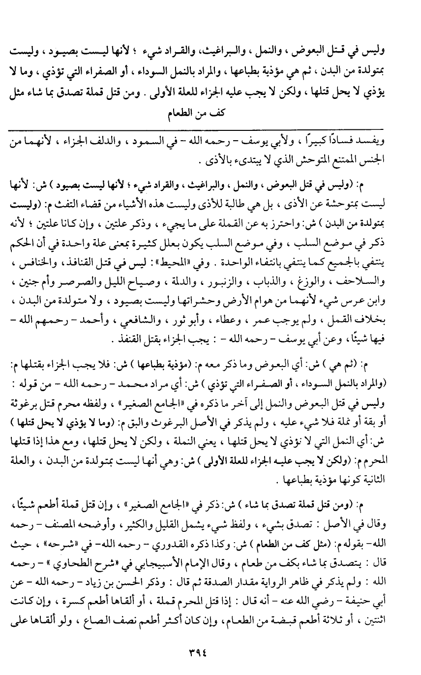 وليس في قتل البعوض والنمل والبراغيث والقراد شيء؛ لأنها ليست بصيود، وليست بمتولدة من البدن، ثم هي مؤذية بطباعها، والمراد بالنمل السوداء، أو الصفراء التي تؤذي، وما لا يؤذي لا يحل قتلها، ولكن لا يجب الجزاء للعلة الأولى.