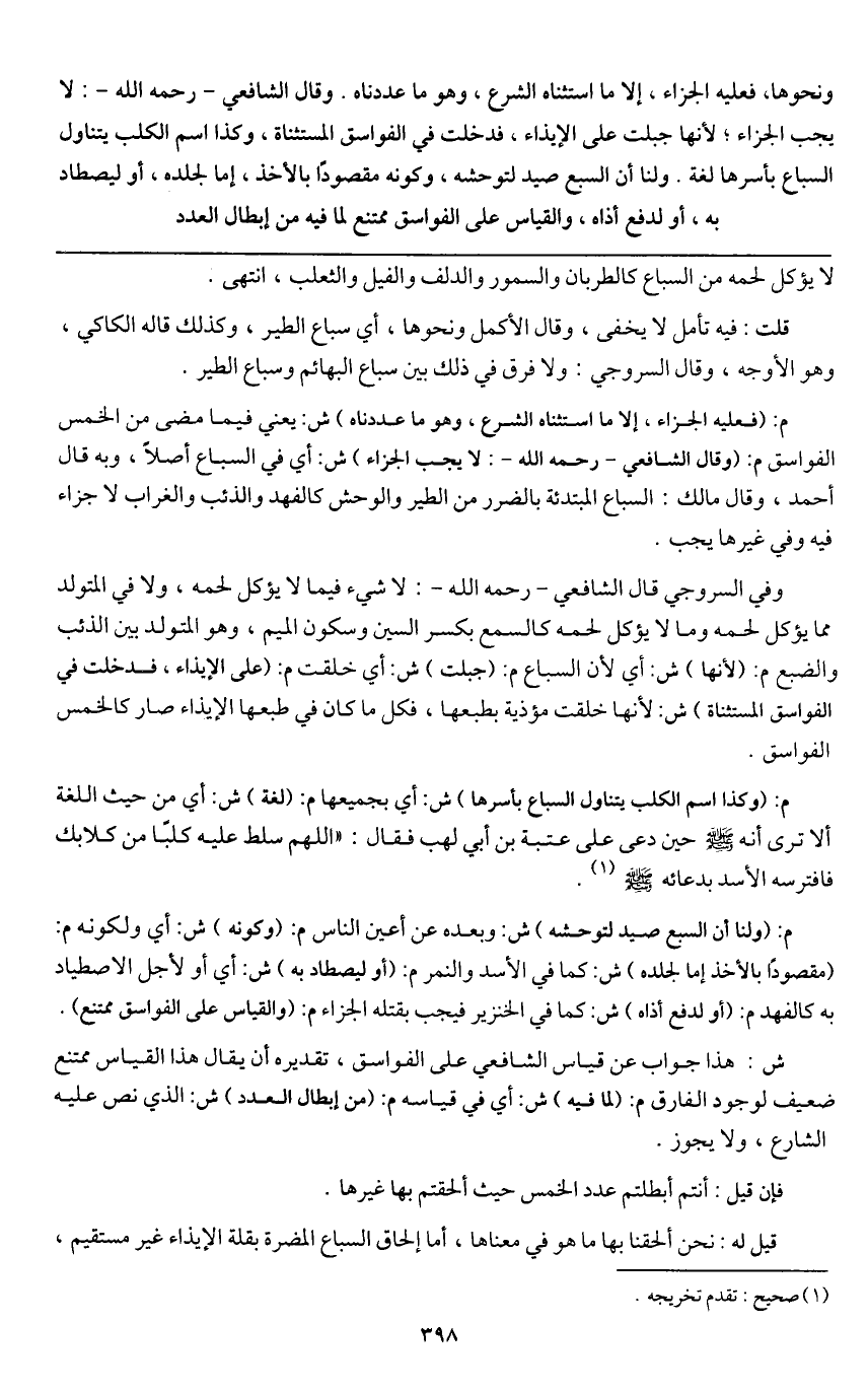 ونحوها، فعليه الجزاء، إلا ما استثناه الشرع، وهو ما عددناه. وقال الشافعي - رَحِمَهُ اللَّهُ -: لا يجب الجزاء؛ لأنها جبلت على الإيذاء، فدخلت في الفواسق المستثناة، وكذا اسم الكلب يتناول السباع بأسرها لغة. ولنا أن السبع صيد لتوحشه، وكونه مقصودا بالأخذ إما لجلده، أو ليصطاد به، أو لدفع أذاه، والقياس على الفواسق ممتنع لما فيه من إبطال العدد