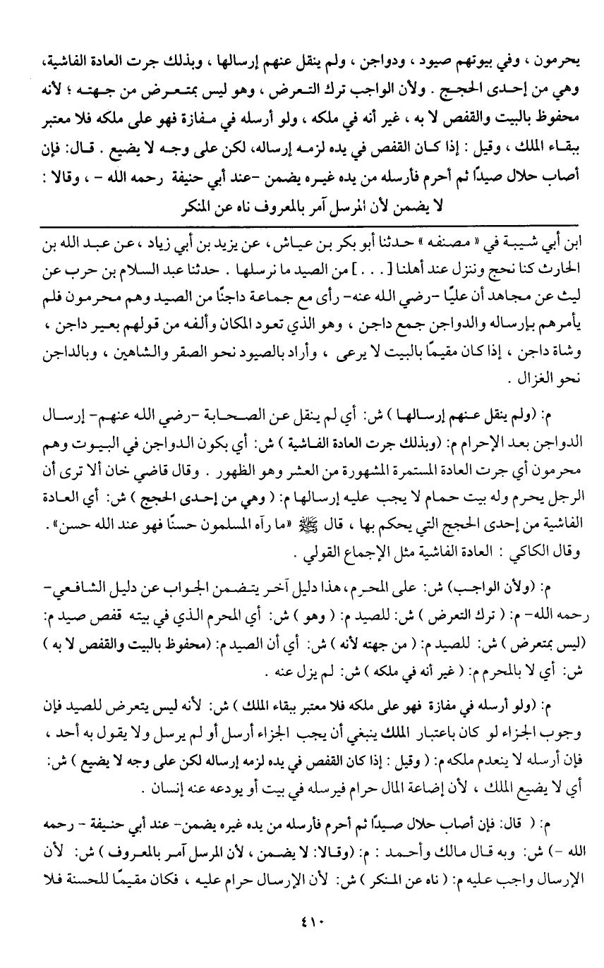 ـــــــــــــــــــــــــــــQابن أبي شيبة في " مصنفه " حدثنا أبو بكر بن عياش، عن يزيد بن أبي زياد، عن عبد الله بن الحارث كنا نحج وننزل عند أهلنا [....] من الصيد ما نرسلها. حدثنا عبد السلام بن حرب عن ليث عن مجاهد أن عليًا - رَضِيَ اللَّهُ عَنْهُ - رأى مع جماعة داجنا من الصيد وهم محرمون فلم يأمرهم بإرساله والدواجن جمع داجن، وهو الذي تعود المكان وألفه من قولهم بعير داجن، وشاة داجن، إذا كان مقيمًا بالبيت لا يرعى، وأراد بالصيود نحو الصقر والشاهين، وبالدواجن نحو الغزال.