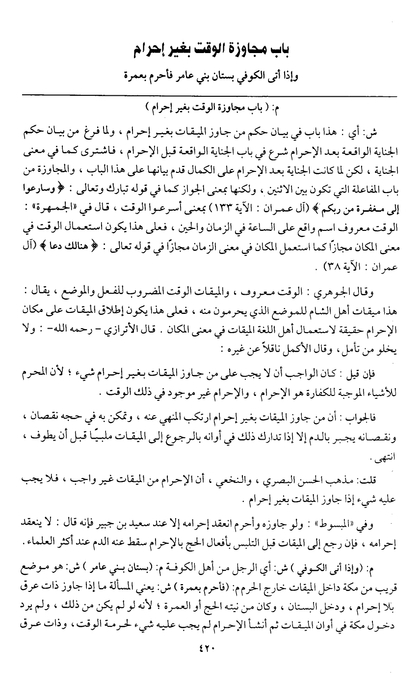 باب مجاوزة الوقت بغير إحرام وإذا أتى الكوفي بستان بني عامر فأحرم بعمرة