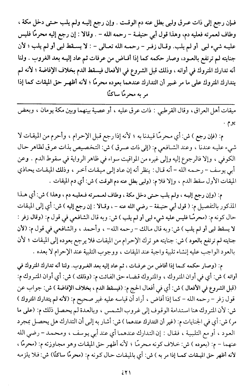 فإن رجع إلى ذات عرق ولبى بطل عنه دم الوقت، وإن رجع إليه ولم يلب حتى دخل مكة وطاف لعمرته فعليه دم، وهذا قول أبي حنيفة - رَحِمَهُ اللَّهُ -، وقالا: إن رجع إليه محرما فليس عليه شيء لبى أو لم يلب. وقال زفر - رَحِمَهُ اللَّهُ تَعَالَى -: لا يسقط لبى أو لم يلب؛ لأن جنايته لم ترتفع بالعود، وصار حكمه كما إذا أفاض من عرفات ثم عاد إليه بعد الغروب. ولنا أنه تدارك المتروك في أوانه، وذلك قبل الشروع في الأفعال فيسقط الدم، بخلاف الإفاضة؛ لأنه لم يتدارك المتروك على ما مر. غير أن التدارك عندهما بعوده محرما؛ لأنه أظهر حق الميقات كما إذا مر به محرما ساكنا.