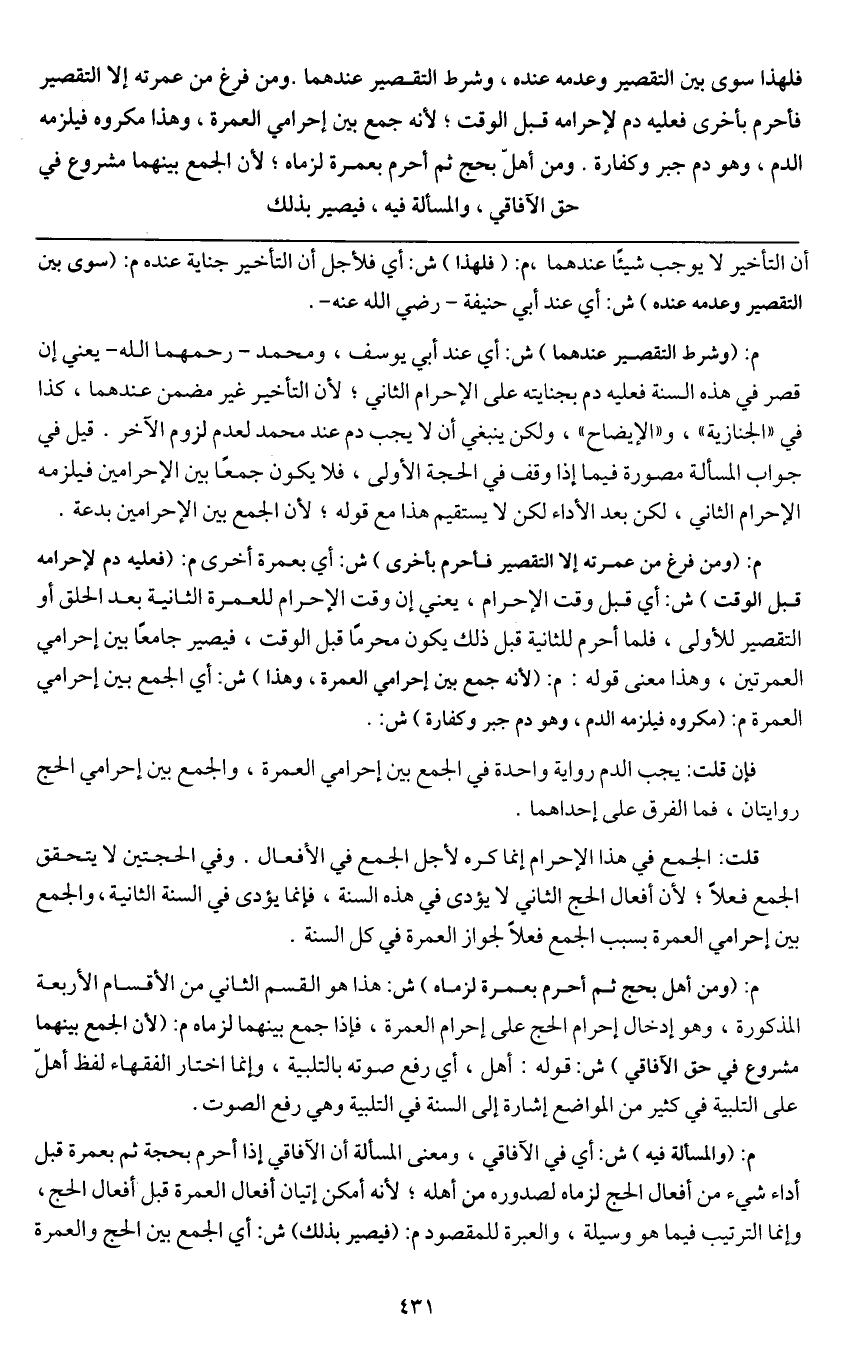 م: (وشرط التقصير عندهما) ش: أي عند أبي يوسف، ومحمد - رحمهما الله - يعني إن قصر في هذه السنة فعليه دم بجنايته على الإحرام الثاني؛ لأن التأخير غير مضمن عندهما، كذا في " الجنازية "، و" الإيضاح "، ولكن ينبغي أن لا يجب دم عند محمد لعدم لزوم الآخر. قيل في جواب المسألة مصورة فيما إذا وقف في الحجة الأولى، فلا يكون جمعًا بين الإحرامين فيلزمه الإحرام الثاني، لكن بعد الأداء لكن لا يستقيم هذا مع قوله؛ لأن الجمع بين الإحرامين بدعة.