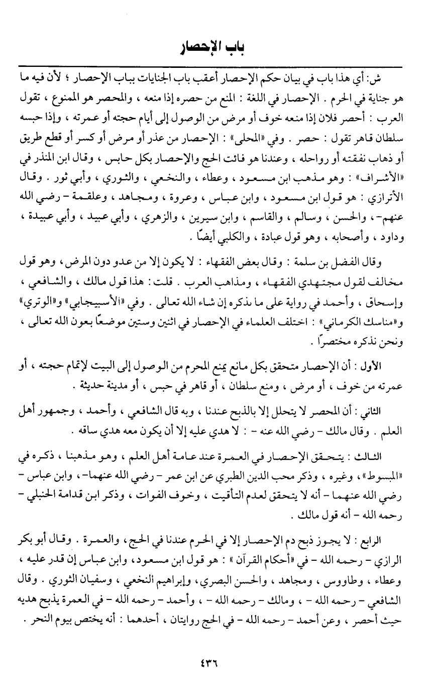الثالث: يتحقق الإحصار في العمرة عند عامة أهل العلم، وهو مذهبنا، ذكره في " المبسوط "، وغيره، وذكر محب الدين الطبري عن ابن عمر - رَضِيَ اللَّهُ عَنْهُمَا -، وابن عباس - رَضِيَ اللَّهُ عَنْهُمَا - أنه لا يتحقق لعدم التأقيت، وخوف الفوات، وذكر ابن قدامة الحنبلي - رَحِمَهُ اللَّهُ - أنه قول مالك.