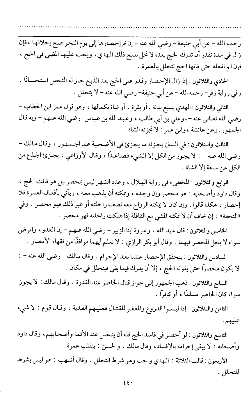الخامس والثلاثون: قال عبد الله وعروة ابنا الزبير - رَضِيَ اللَّهُ عَنْهُمْ -: إن العدو والمرض سواء لا يحل المحصر فيهما. وقال أبو بكر الرازي: لا نعلم أيهما موافقًا من فقهاء الأمصار.
