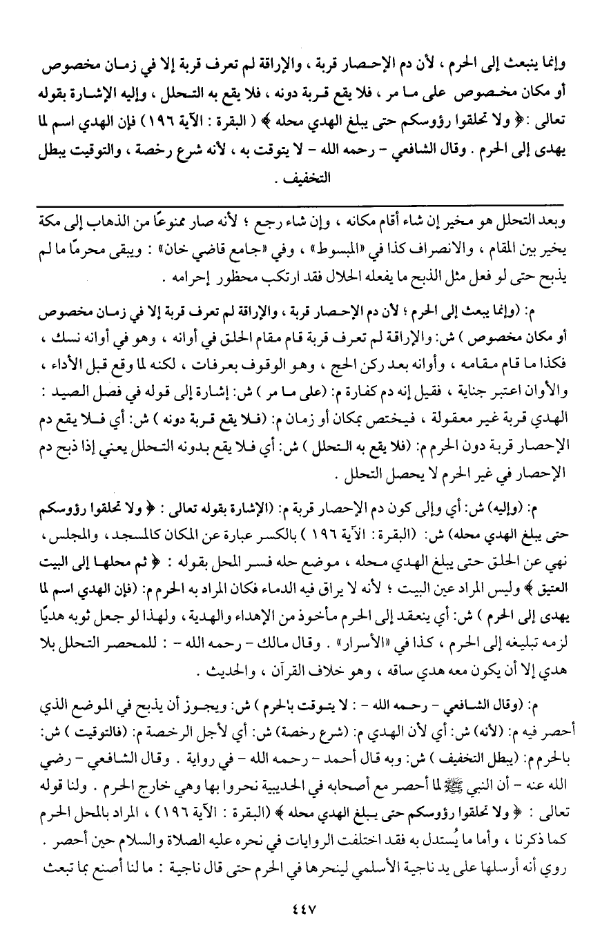 م: (وإليه) ش: أي وإلى كون دم الإحصار قربة. م: (الإشارة بقوله تعالى: {وَلَا تَحْلِقُوا رُءُوسَكُمْ حَتَّى يَبْلُغَ الْهَدْيُ مَحِلَّهُ} [البقرة: 196] (البقرة: الآية 196)) بالكسر عبارة عن المكان كالمسجد والمجلس، نهي عن الحلق حتى يبلغ الهدي محله، موضع حله؛ فسر المحل بقوله: {ثُمَّ مَحِلُّهَا إِلَى الْبَيْتِ الْعَتِيقِ} [الحج: 33] وليس المراد عين البيت؛ لأنه لا يراق فيه الدماء فكان المراد به الحرم. م: (فإن الهدي اسم لما يهدى إلى الحرم) ش: أي ينعقد إلى الحرم مأخوذ من الإهداء والهدية، ولهذا لو جعل ثوبه هديًا لزمه تبليغه إلى الحرم، كذا في " الأسرار ". وقال مالك - رَحِمَهُ اللَّهُ -: للمحصر التحلل بلا هدي إلا أن يكون معه هدي ساقه، وهو خلاف القرآن، والحديث.