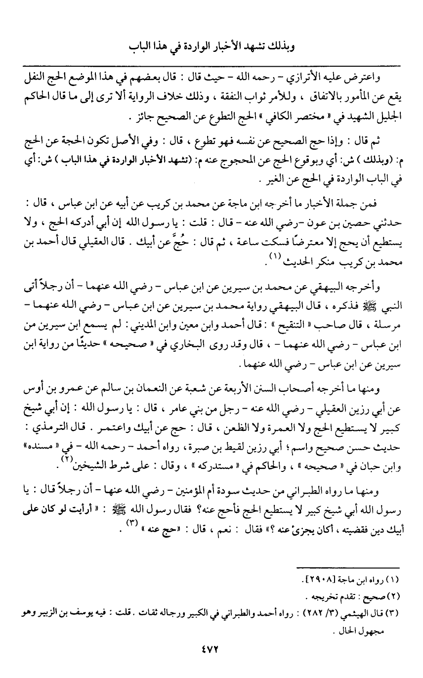 فمن جملة الأخبار ما أخرجه ابن ماجه عن محمد بن كريب عن أبيه عن ابن عباس، قال: حدثني حصين بن عون - رَضِيَ اللَّهُ عَنْهُ - قال: قلت: يا رسول الله، «إن أبي أدركه الحج، ولا يستطيع أن يحج إلا معترضا فسكت ساعة، ثم قال: حج عن أبيك» . قال العقيلي قال أحمد بن محمد بن كريب منكر الحديث.