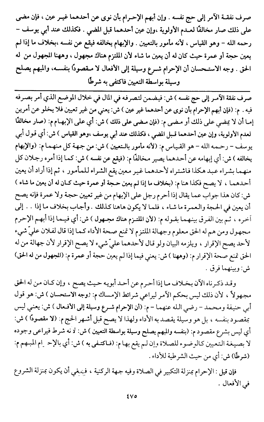 صرف نفقة الآمر إلى حج نفسه. وإن أبهم الإحرام بأن نوى عن أحدهما غير عين، فإن مضى على ذلك صار مخالفا لعدم الأولوية، وإن عين أحدهما قبل المضي. فكذلك عند أبي يوسف - رَحِمَهُ اللَّهُ - وهو القياس؛ لأنه مأمور بالتعيين. والإبهام يخالفه فيقع عن نفسه، بخلاف ما إذا لم يعين حجة أو عمرة حيث كان له أن يعين ما شاء لأن الملتزم هناك مجهول، وهاهنا المجهول من له الحق. وجه الاستحسان أن الإحرام شرع وسيلة إلى الأفعال لا مقصودا بنفسه. والمبهم يصلح وسيلة بواسطة التعيين فاكتفى به شرطا