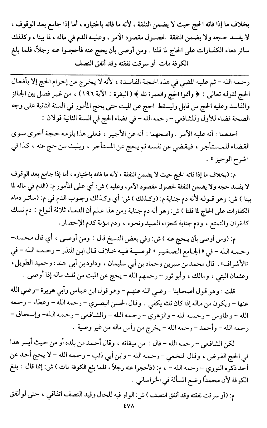 ـــــــــــــــــــــــــــــQ- رَحِمَهُ اللَّهُ - ثم عليه المضي في هذه الحجة الفاسدة؛ لأنه لا يخرج عن إحرام الحج إلا بأفعال الحج لِقَوْلِهِ تَعَالَى: {وَأَتِمُّوا الْحَجَّ وَالْعُمْرَةَ لِلَّهِ} [البقرة: 196] (البقرة: الآية 196) ، من غير فصل بين الجائز والفاسد وعليه الحج من قابل وليسقط الحج عن الميت حتى يحج المأمور في السنة الثانية على وجه الصحة قضاء للأول وللشافعي - رَحِمَهُ اللَّهُ - في قضاء الحج في السنة الثانية قولان: