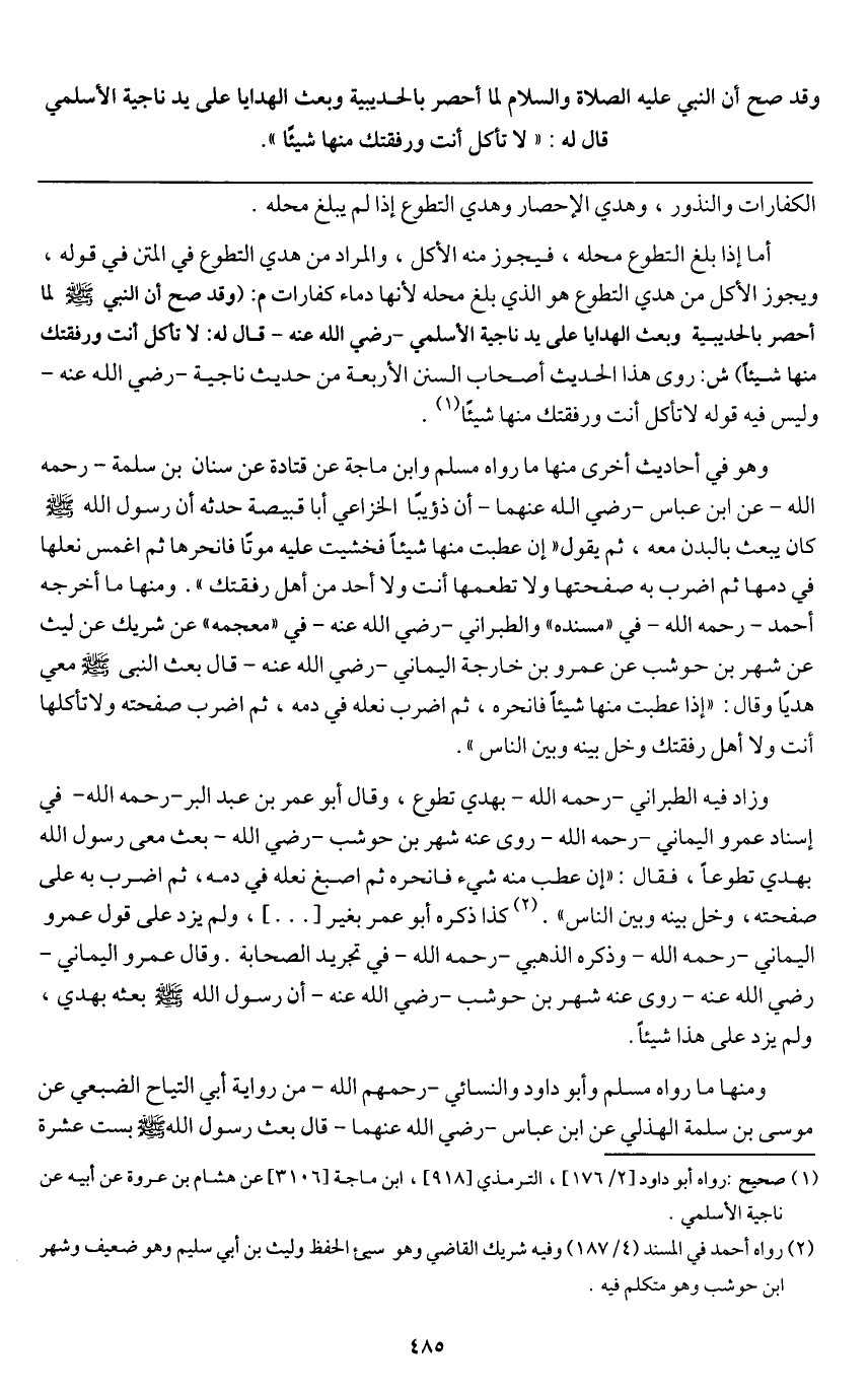 وقد صح «أن النبي - عَلَيْهِ الصَّلَاةُ وَالسَّلَامُ - لما أحصر بالحديبية وبعث الهدايا على يد ناجية الأسلمي قال له: " لا تأكل أنت ورفقتك منها شيئا» .