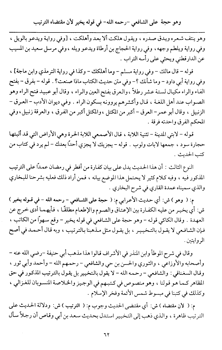 وقال في شرح الموطأ وابن المنذر في الأشراف قالوا هذا مذهب أبي حنيفة - رَضِيَ اللَّهُ عَنْهُ - وأصحابه والأوزاعي، والثوري والحسن بن حي والشافعي - رَحِمَهُمُ اللَّهُ - وأحمد وأبي ثور، وقال السغناقي: والشافعي - رَحِمَهُ اللَّهُ - لا يقول بالتخيير بل يقول بالترتيب المذكور في حق المظاهر كما هو قولنا، وهو منصوص في كتبهم في الوجيز والخلاصة المسنوبان للغزالي، وكذلك في كتبنا في مبسوط شمس الأئمة وفخر الإسلام.