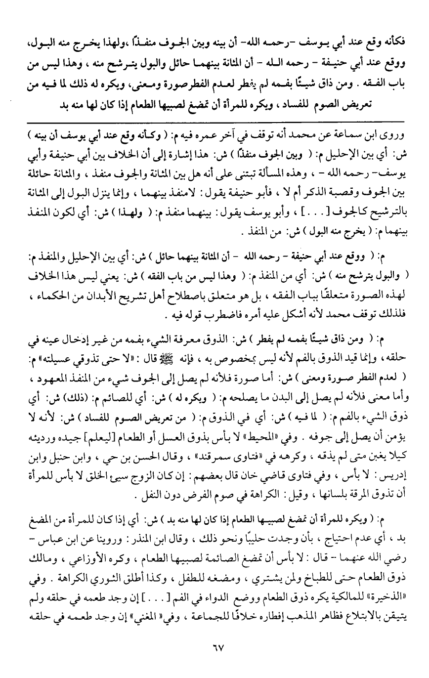 ووقع عند أبي حنيفة - رَحِمَهُ اللَّهُ - أن المثانة بينهما حائل والبول يترشح منه، وهذا ليس من باب الفقه. ومن ذاق شيئا بفمه لم يفطر لعدم الفطر صورة ومعنى، ويكره له ذلك لما فيه من تعريض الصوم للفساد، ويكره للمرأة أن تمضغ لصبيها الطعام إذا كان لها منه بد