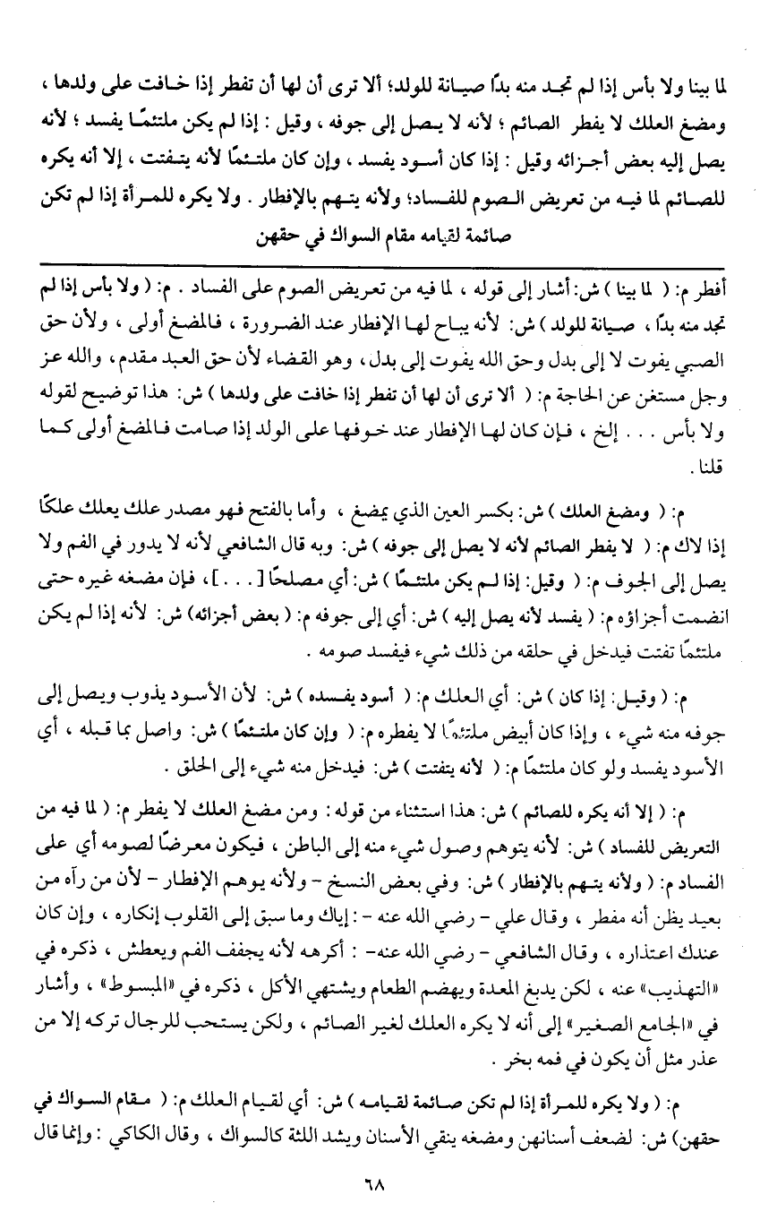 ومضغ العلك لا يفطر الصائم؛ لأنه لا يصل إلى جوفه، وقيل: إذا لم يكن ملتئما يفسد؛ لأنه يصل إليه بعض أجزائه وقيل: إذا كان أسود يفسد، وإن كان ملتئما لأنه يتفتت، إلا أنه يكره للصائم لما فيه من تعريض الصوم للفساد، ولأنه يتهم بالإفطار. ولا يكره للمرأة إذا لم تكن صائمة لقيامه مقام السواك في حقهن