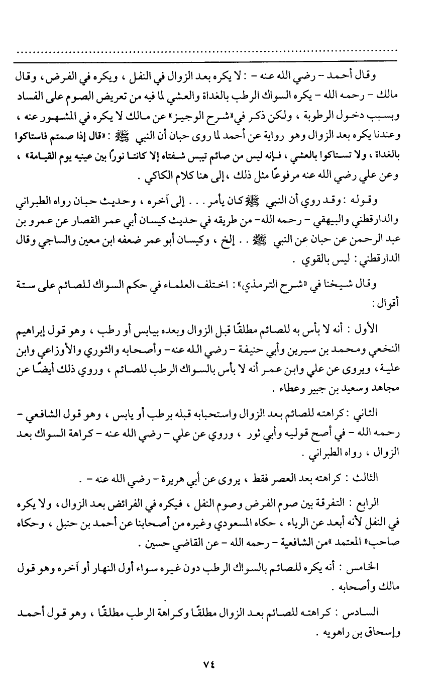 الثاني: كراهته للصائم بعد الزوال واستحبابه قبله برطب أو يابس، وهو قول الشافعي - رَحِمَهُ اللَّهُ - في أصح قوليه وأبي ثور، وروي عن علي - رَضِيَ اللَّهُ عَنْهُ - كراهة السواك بعد الزوال، رواه الطبراني.
