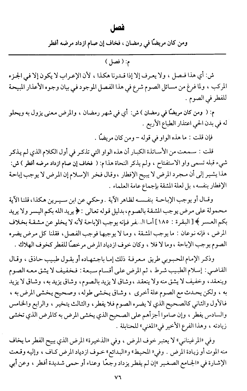 قلت سمعت من الأساتذة الكبار أن هذه الواو التي تذكر في أول الكلام الذي لم يذكر شيء قبله تسمى واو الاستفتاح، ولم يذكر النحاة هذا م: (فخاف إن صام ازداد مرضه أفطر) ش: هذا يشير إلى أن مجرد المرض لا يبيح الإفطار، وقال فخر الإسلام إن المرض لا يوجب إباحة الإفطار بنفسه، بل لعلة المشقة بإجماع عامة العلماء.