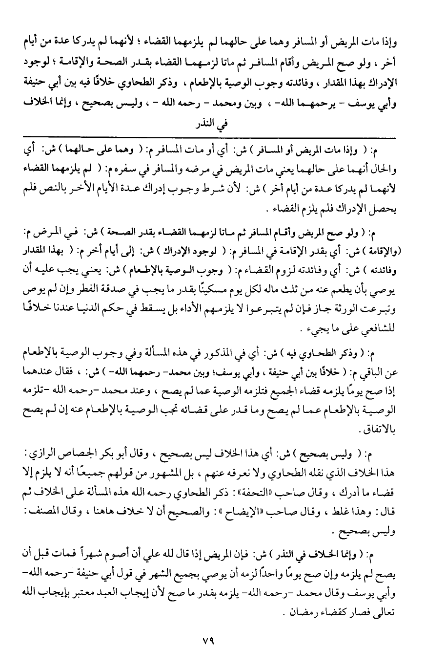 وإذا مات المريض أو المسافر وهما على حالهما لم يلزمهما القضاء؛ لأنهما لم يدركا عدة من أيام أخر، ولو صح المريض وأقام المسافر ثم ماتا لزمهما القضاء بقدر الصحة والإقامة؛ لوجود الإدراك بهذا المقدار، وفائدته وجوب الوصية بالإطعام، وذكر الطحاوي خلافا فيه بين أبي حنيفة وأبي يوسف - يرحمهما الله -، وبين محمد - رَحِمَهُ اللَّهُ -، وليس بصحيح، وإنما الخلاف في النذر