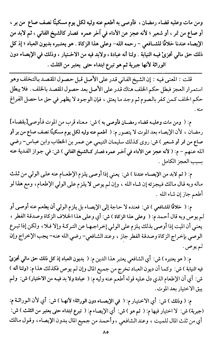 ومن مات وعليه قضاء رمضان، فأوصى به أطعم عنه وليه لكل يوم مسكينا نصف صاع من بر، أو صاعا من تمر أو شعير؛ لأنه عجز عن الأداء في آخر عمره فصار كالشيخ الفاني، ثم لا بد من الإيصاء عندنا خلافا للشافعي - رَحِمَهُ اللَّهُ - وعلى هذا الزكاة. هو يعتبره بديون العباد؛ إذ كل ذلك حق مالي تجزئ فيه النيابة. ولنا أنه عبادة، ولا بد فيه من الاختيار، وذلك في الإيصاء دون الوراثة لأنها جبرية ثم هو تبرع ابتداء حتى يعتبر من الثلث.