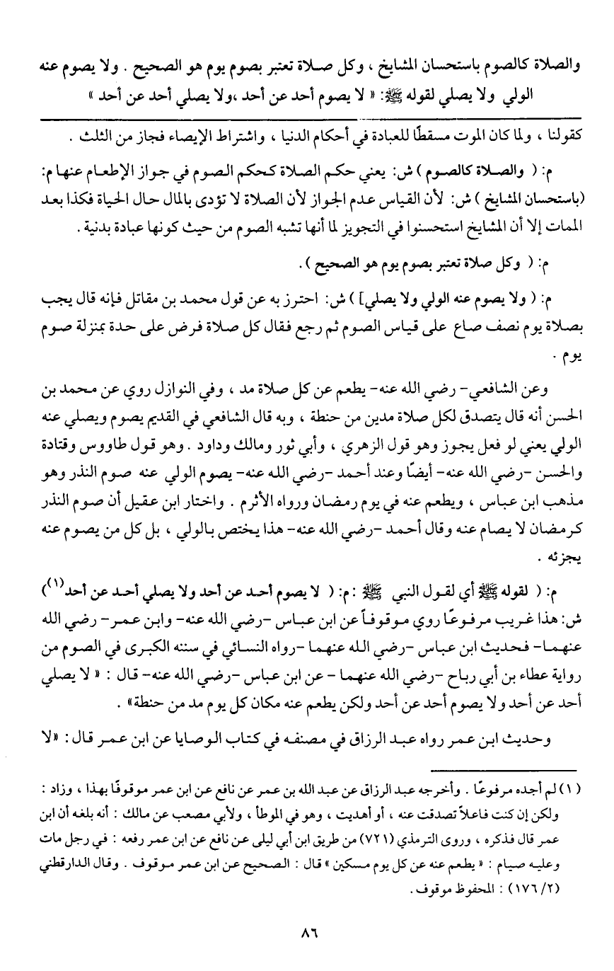 والصلاة كالصوم باستحسان المشايخ، وكل صلاة تعتبر بصوم يوم هو الصحيح. ولا يصوم عنه الولي ولا يصلي لقوله - صَلَّى اللَّهُ عَلَيْهِ وَسَلَّمَ - «لا يصوم أحد عن أحد ولا يصلي أحد عن أحد»