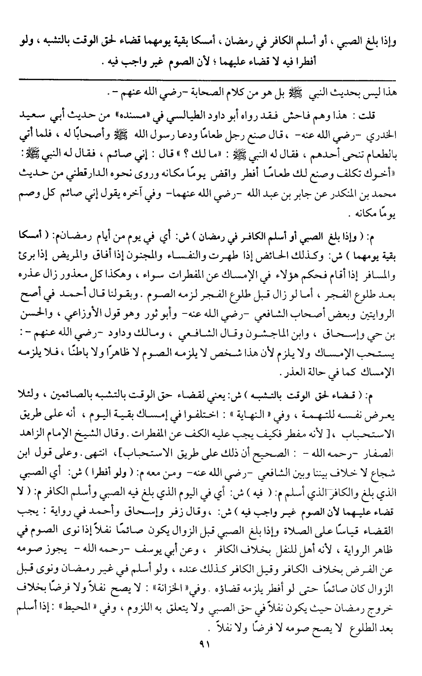 م: (وإذا بلغ الصبي، أو أسلم الكافر في رمضان) ش: أي في يوم من أيام رمضان م: (أمسكا بقية يومهما) ش: وكذلك الحائض إذا طهرت والنفساء والمجنون إذا أفاق والمريض إذا برئ والمسافر إذا أقام فحكم هؤلاء في الإمساك عن المفطرات سواء، وهكذا كل معذور زال عذره بعد طلوع الفجر، أما لو زال قبل طلوع الفجر لزمه الصوم. وبقولنا قال أحمد في أصح الروايتين وبعض أصحاب الشافعي - رَضِيَ اللَّهُ عَنْهُ - وأبو ثور وهو قول الأوزاعي، والحسن بن حي وإسحاق، وابن الماجشون وقال الشافعي، ومالك وداود - رَضِيَ اللَّهُ عَنْهُمْ -: يستحب الإمساك ولا يلزم لأن هذا شخص لا يلزمه الصوم لا ظاهراً ولا باطناً، فلا يلزمه الإمساك كما في حالة العذر.