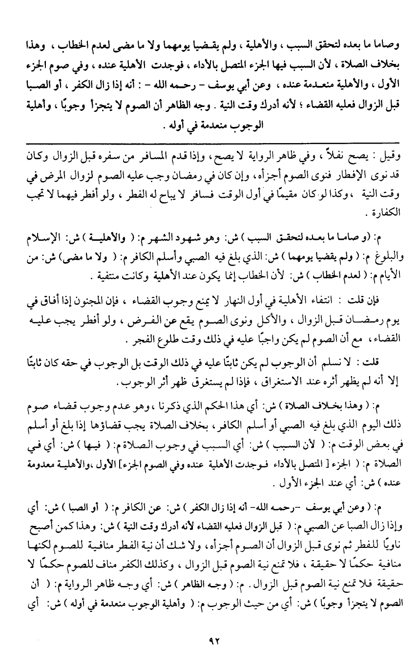 م: (وعن أبي يوسف - رَحِمَهُ اللَّهُ -: أنه إذا زال الكفر) ش: عن الكافر م: (أو الصبا) ش: أي وإذا زال الصبا عن الصبي م: (قبل الزوال فعليه القضاء؛ لأنه أدرك وقت النية) ش: وهذا كمن أصبح ناوياً للفطر ثم نوى قبل الزوال أن الصوم أجزأه، ولا شك أن نية الفطر منافية للصوم لكنها منافية حكماً لا حقيقة، فلا تمنع نية الصوم قبل الزوال، وكذلك الكفر مناف للصوم حكماً لا حقيقة لا تمنع نية الصوم قبل الزوال م: (وجه الظاهر) ش: أي وجه ظاهر الرواية م: (أن الصوم لا يتجزأ وجوبا) ش: أي من حيث الوجوب م: (وأهلية الوجوب منعدمة في أوله) ش: أي