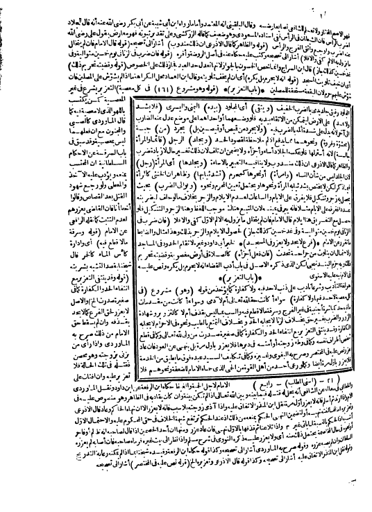 (بَابٌ) (التَّعْزِيرُ) هُوَ لُغَةً التَّأْدِيبُ وَشَرْعًا تَأْدِيبٌ عَلَى ذَنْبٍ لَا حَدَّ فِيهِ وَلَا كَفَّارَةَ كَمَا يُؤْخَذُ مِنْ قَوْلِهِ (وَهُوَ) مَشْرُوعٌ (فِي كُلِّ مَعْصِيَةٍ لَا حَدَّ فِيهَا وَلَا كَفَّارَةَ) سَوَاءٌ أَكَانَتْ حَقًّا لِلَّهِ تَعَالَى أَمْ لِآدَمِيٍّ وَسَوَاءٌ أَكَانَتْ مِنْ مُقَدِّمَاتِ مَا فِيهِ حَدٌّ كَمُبَاشَرَةِ أَجْنَبِيَّةٍ فِي غَيْرِ الْفَرْجِ وَسَرِقَةِ مَا لَا قَطْعَ فِيهِ، وَالسَّبُّ بِمَا لَيْسَ بِقَذْفٍ أَمْ لَا كَالتَّزْوِيرِ وَشَهَادَةِ الزُّورِ، وَالضَّرْبِ بِغَيْرِ حَقٍّ بِخِلَافِ الزِّنَا لِإِيجَابِهِ الْحَدَّ وَبِخِلَافِ التَّمَتُّعِ بِالطِّيبِ وَنَحْوِهِ فِي الْإِحْرَامِ لِإِيجَابِهِ الْكَفَّارَةَ وَقَدْ يَنْتَفِي التَّعْزِيرُ مَعَ انْتِفَاءِ الْحَدِّ، وَالْكَفَّارَةِ كَمَا فِي صَغِيرَةٍ صَدَرَتْ مِنْ وَلِيٍّ لِلَّهِ تَعَالَى، وَكَمَا فِي قَطْعِ شَخْصٍ أَطْرَافَ نَفْسِهِ وَكَمَا فِي وَطْءِ زَوْجَتِهِ أَوْ أَمَتِهِ فِي دُبُرِهَا فَلَا يُعَذَّرُ بِأَوَّلِ مَرَّةٍ بَلْ يُنْهَى عَنْ الْعَوْدِ، فَإِنْ عَادَ عُزِّرَ نَصَّ عَلَيْهِ فِي الْمُخْتَصَرِ وَصَرَّحَ بِهِ الْبَغَوِيّ وَغَيْرُهُ وَكَمَا فِي تَكْلِيفِ السَّيِّدِ عَبْدَهُ فَوْقَ مَا يُطِيقُ مِنْ الْخِدْمَةِ فَلَا يُعَزَّرُ بِأَوَّلِ مَرَّةٍ أَيْضًا وَكَمَا لَوْ رَعَى أَحَدٌ مِنْ أَهْلِ الْقُوَّةِ مِنْ الْحِمَى الَّذِي حَمَاهُ الْإِمَامُ لِلضَّعَفَةِ وَنَحْوِهِمْ فَلَا
