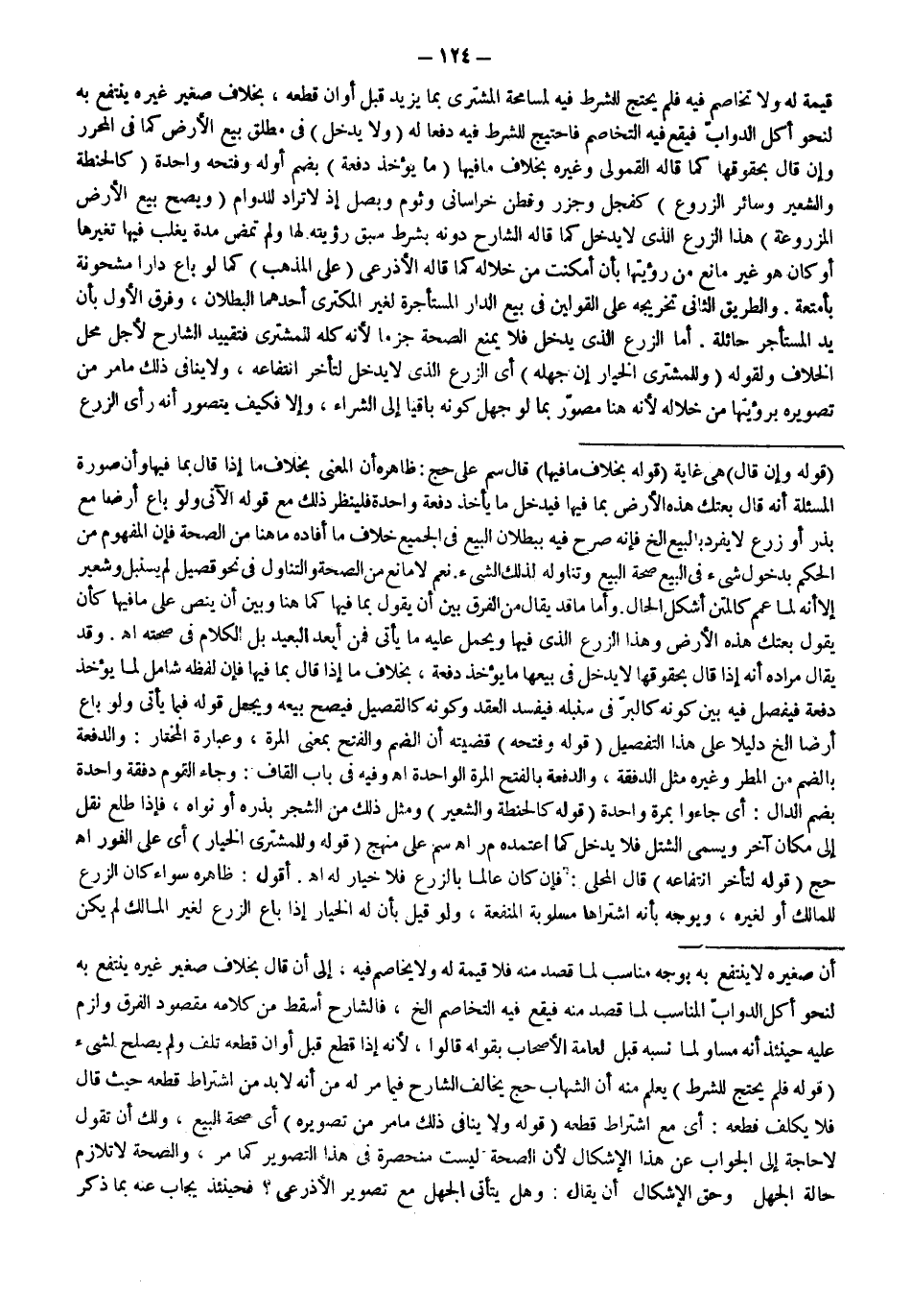 نَعَمْ لَا مَانِعَ مِنْ الصِّحَّةِ وَالتَّنَاوُلِ فِي نَحْوِ قَصِيلٍ لَمْ يُسَنْبِلْ وَشَعِيرٍ إلَّا أَنَّهُ لَمَّا عَمَّمَ كَالْمَتْنِ أَشْكَلَ الْحَالَ وَأَمَّا مَا قَدْ يُقَالُ مِنْ الْفَرْقِ بَيْنَ أَنْ يَقُولَ بِمَا فِيهَا كَمَا هُنَا وَبَيْنَ أَنْ يَنُصَّ عَلَى مَا فِيهَا كَأَنْ يَقُولَ بِعْتُك هَذِهِ الْأَرْضَ وَهَذَا الزَّرْعَ الَّذِي فِيهَا وَيُحْمَلُ عَلَيْهِ مَا يَأْتِي فَمِنْ أَبْعَدِ الْبَعِيدِ بَلْ الْكَلَامُ فِي صِحَّتِهِ اهـ.
