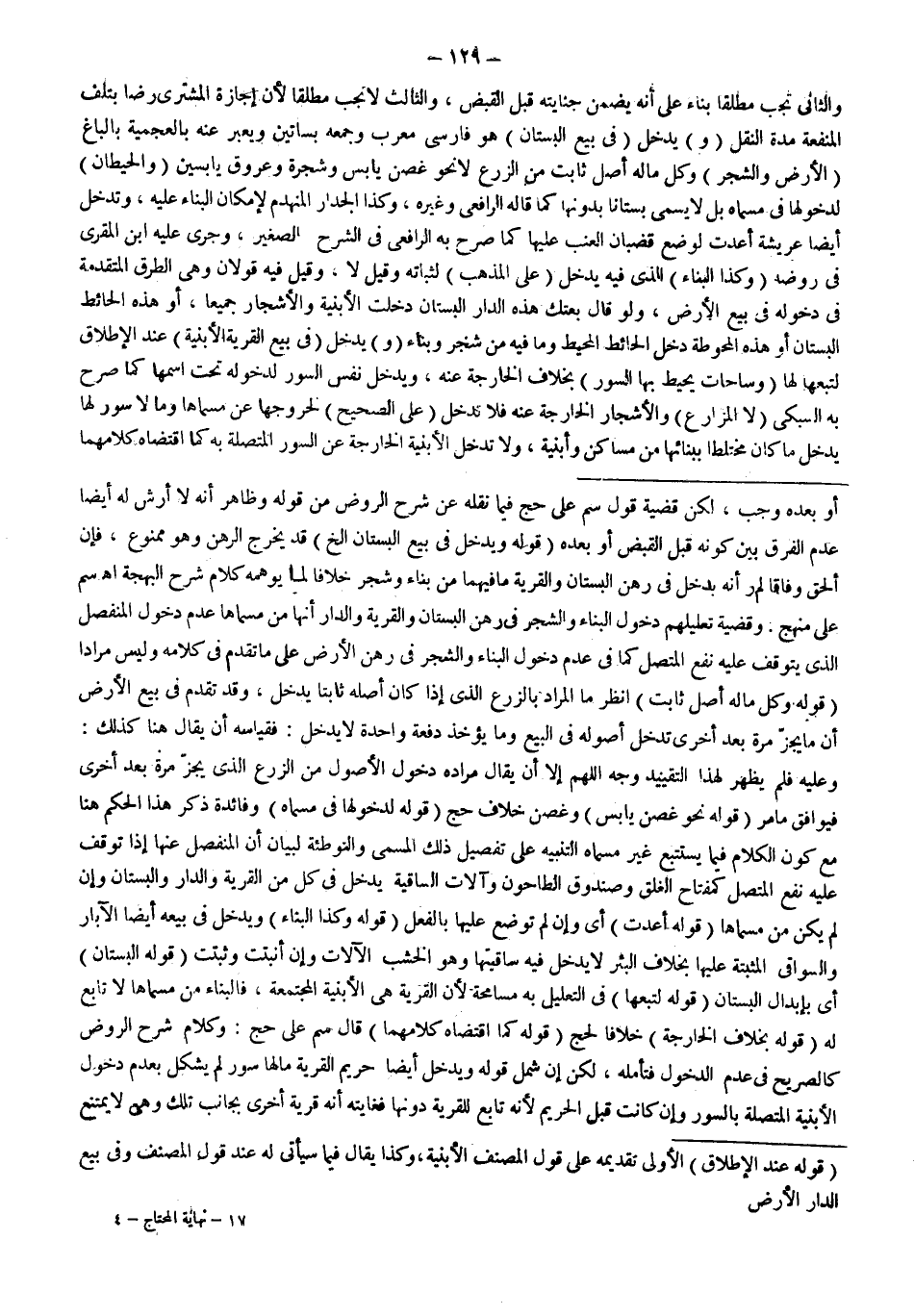 وَقَضِيَّةُ تَعْلِيلِهِمْ دُخُولُ الْبِنَاءِ وَالشَّجَرِ فِي رَهْنِ الْبُسْتَانِ وَالْقَرْيَةِ وَالدَّارِ أَنَّهَا مِنْ مُسَمَّاهَا عَدَمُ دُخُولِ الْمُنْفَصِلِ الَّذِي يَتَوَقَّفُ عَلَيْهِ نَفْعُ الْمُتَّصِلِ فِي عَدَمِ دُخُولِ الْبِنَاءِ وَالشَّجَرِ فِي رَهْنِ الْأَرْضِ عَلَى مَا تَقَدَّمَ فِي كَلَامِهِ وَلَيْسَ مُرَادًا (قَوْلُهُ: وَكُلُّ مَا لَهُ أَصْلٌ ثَابِتٌ) اُنْظُرْ مَا الْمُرَادُ بِالزَّرْعِ الَّذِي إذَا كَانَ أَصْلُهُ ثَابِتًا يَدْخُلُ، وَقَدْ تَقَدَّمَ فِي بَيْعِ الْأَرْضِ أَنَّ مَا يُجَزُّ مَرَّةً بَعْدَ أُخْرَى أُصُولُهُ فِي الْبَيْعِ وَمَا يُؤْخَذُ دَفْعَةً وَاحِدَةً لَا يَدْخُلُ: فَقِيَاسُهُ أَنْ يُقَالَ هُنَا كَذَلِكَ: وَعَلَيْهِ فَلَمْ يَظْهَرْ لِهَذَا التَّقْيِيدِ وَجْهٌ اللَّهُمَّ إلَّا أَنْ يُقَالَ مُرَادُهُ دُخُولُ الْأُصُولِ مِنْ الزَّرْعِ الَّذِي يُجَزُّ مَرَّةً بَعْدَ أُخْرَى فَيُوَافِقُ مَا مَرَّ (قَوْلُهُ: نَحْوَ غُصْنٍ يَابِسٍ) وَغُصْنِ خِلَافٍ حَجّ (قَوْلُهُ: لِدُخُولِهَا فِي مُسَمَّاهُ) وَفَائِدَةُ ذِكْرِ هَذَا الْحُكْمِ هُنَا مَعَ كَوْنِ الْكَلَامِ فِيمَا يَسْتَتْبِعُ غَيْرَ مُسَمَّاهُ التَّنْبِيهُ عَلَى تَفْصِيلِ ذَلِكَ الْمُسَمَّى وَالتَّوْطِئَةُ لِبَيَانِ أَنَّ الْمُنْفَصِلَ عَنْهَا إذَا تَوَقَّفَ عَلَيْهِ نَفْعُ الْمُتَّصِلِ كَمِفْتَاحِ الْغَلْقِ وَصُنْدُوقِ الطَّاحُونِ وَآلَاتِ السَّاقِيَةِ يَدْخُلُ فِي كُلٍّ مِنْ الْقَرْيَةِ وَالدَّارِ وَالْبُسْتَانِ وَإِنْ لَمْ يَكُنْ مِنْ مُسَمَّاهَا (قَوْلُهُ: أُعِدَّتْ) أَيْ وَإِنْ لَمْ تُوضَعْ عَلَيْهَا بِالْفِعْلِ (قَوْلُهُ: وَكَذَا الْبِنَاءُ) وَيَدْخُلُ فِي بَيْعِهِ أَيْضًا الْآبَارُ وَالسَّوَاقِي الْمُثَبَّتَةُ عَلَيْهَا بِخِلَافِ الْبِئْرِ لَا يَدْخُلُ فِيهِ سَاقِيَتُهَا وَهُوَ الْخَشَبُ الْآلَاتُ وَإِنْ أُنْبِتَتْ وَثُبِّتَتْ (قَوْلُهُ: الْبُسْتَانَ) أَيْ بِإِبْدَالِ الْبُسْتَانِ