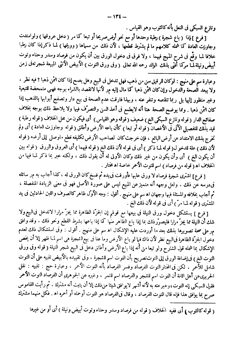[فَرْعٌ] إذَا (بَاعَ شَجَرَةً) رَطْبَةً وَحْدَهَا أَوْ مَعَ نَحْوِ أَرْضٍ صَرِيحًا أَوْ تَبَعًا كَمَا مَرَّ (دَخَلَ عُرُوقُهَا) وَلَوْ امْتَدَّتْ وَجَاوَزَتْ الْعَادَةَ كَمَا شَمَلَهُ كَلَامُهُمْ مَا لَمْ يَشْتَرِطْ قَطْعُهَا، لِأَنَّ ذَلِكَ مِنْ مُسَمَّاهَا (وَوَرَقُهَا) لِمَا ذَكَرَ إذَا كَانَ رَطْبًا خِلَافًا لِمَا وَقَعَ فِي شَرْحِ الْمَنْهَجِ فِيهَا، وَلَا فَرْقَ فِي دُخُولِ الْوَرَقِ بَيْنَ أَنْ يَكُونَ مِنْ فِرْصَادٍ وَسِدْرٍ وَحِنَّاءٍ وَتُوتٍ أَبْيَضَ وَنِيلَةٍ لِمَا مَرَّ كَمَا أَفْتَى بِذَلِكَ الْوَالِدُ - رَحِمَهُ اللَّهُ تَعَالَى - (وَفِي) (وَرَقِ التُّوتِ) الْأَبْيَضِ الْأُنْثَى الْمَبِيعَةِ شَجَرَتُهُ فِي زَمَنِ