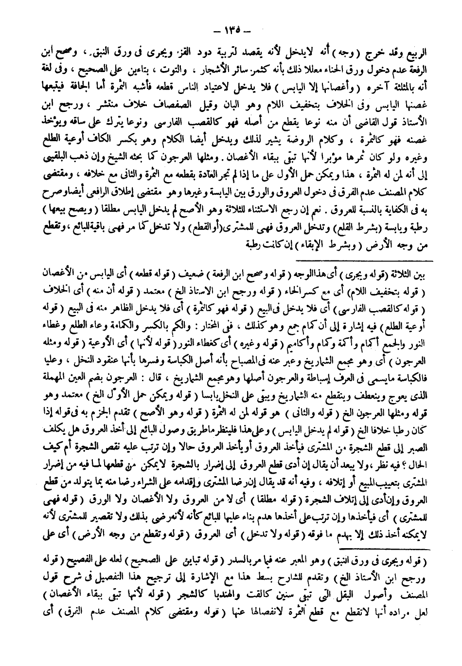 ـــــــــــــــــــــــــــــQقَوْلُهُ: وَيَجْرِي فِي وَرَقِ النَّبْقِ) وَهُوَ الْمُعَبَّرُ عَنْهُ فِيمَا مَرَّ بِالسِّدْرِ. (قَوْلُهُ: بِتَاءَيْنِ عَلَى الصَّحِيحِ) لَعَلَّهُ عَلَى الْفَصِيحِ. (قَوْلُهُ: وَرَجَّحَ ابْنُ الْأُسْتَاذِ إلَخْ) وَتَقَدَّمَ لِلشَّارِحِ بَسْطُ هَذَا مَعَ الْإِشَارَةِ إلَى تَرْجِيحِ هَذَا التَّفْصِيلِ فِي شَرْحِ قَوْلِ الْمُصَنِّفِ وَأُصُولُ الْبَقْلِ الَّتِي تَبْقَى سِنِينَ كَالْقَتِّ وَالْهِنْدَبَا كَالشَّجَرِ. (قَوْلُهُ: لِأَنَّهَا تَبْقَى بِبَقَاءِ الْأَغْصَانِ) لَعَلَّ مُرَادَهُ أَنَّهَا لَا تُقْطَعُ مَعَ قَطْعِ الثَّمَرَةِ لِانْفِصَالِهَا عَنْهَا. (قَوْلُهُ: وَمُقْتَضَى كَلَامِ الْمُصَنِّفِ عَدَمُ الْفَرْقِ) أَيْ