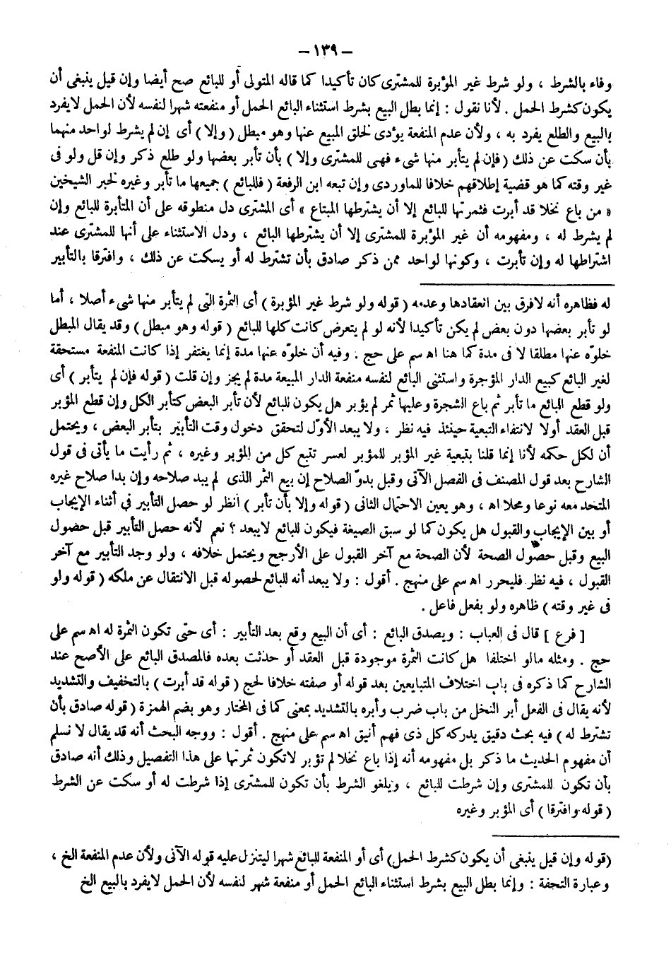 وَفِيهِ أَنَّ خُلُوَّهُ عَنْهَا إنَّمَا يُغْتَفَرُ إذَا كَانَتْ الْمَنْفَعَةُ مُسْتَحَقَّةً لِغَيْرِ الْبَائِعِ كَبَيْعِ الدَّارِ الْمُؤَجَّرَةِ وَاسْتَثْنَى الْبَائِعُ لِنَفْسِهِ مَنْفَعَةَ الدَّارِ الْمَبِيعَةِ مُدَّةً لَمْ يَجُزْ وَإِنْ قُلْت (قَوْلُهُ: فَإِنْ لَمْ يَتَأَبَّرْ) أَيْ وَلَوْ قَطَعَ الْبَائِعُ مَا تَأَبَّرَ ثُمَّ بَاعَ الشَّجَرَةَ وَعَلَيْهَا ثَمَرٌ لَمْ يُؤَبَّرْ هَلْ يَكُونُ لِلْبَائِعِ لِأَنَّ تَأَبُّرَ الْبَعْضِ كَتَأَبُّرِ الْكُلِّ وَإِنْ قَطَعَ الْمُؤَبَّرَ قَبْلَ الْعَقْدِ أَوَّلًا لِانْتِفَاءِ التَّبَعِيَّةِ حِينَئِذٍ فِيهِ نَظَرٌ، وَلَا يَبْعُدُ الْأَوَّلُ لِتَحَقُّقِ دُخُولِ وَقْتِ التَّأْبِيرِ بِتَأَبُّرِ الْبَعْضِ، وَيُحْتَمَلُ أَنَّ لِكُلٍّ حُكْمَهُ لِأَنَّا إنَّمَا قُلْنَا بِتَبَعِيَّةِ غَيْرِ الْمُؤَبَّرِ لِلْمُؤَبَّرِ لِعُسْرِ تَتَبُّعِ كُلٍّ مِنْ الْمُؤَبَّرِ وَغَيْرِهِ، ثُمَّ رَأَيْت مَا يَأْتِي فِي قَوْلِ الشَّارِحِ بَعْدَ قَوْلِ الْمُصَنِّفِ فِي الْفَصْلِ الْآتِي وَقَبْلَ بُدُوِّ الصَّلَاحِ إنْ بِيعَ الثَّمَرُ الَّذِي لَمْ يَبْدُ صَلَاحُهُ وَإِنْ بَدَا صَلَاحُ غَيْرِهِ الْمُتَّحِدِ مَعَهُ نَوْعًا وَمَحَلًّا اهـ، وَهُوَ يُعِينُ الِاحْتِمَالَ الثَّانِيَ (قَوْلُهُ: وَإِلَّا بِأَنْ تَأَبَّرَ) اُنْظُرْ لَوْ حَصَلَ التَّأْبِيرُ فِي أَثْنَاءِ الْإِيجَابِ أَوْ بَيْنَ الْإِيجَابِ وَالْقَبُولِ هَلْ يَكُونُ كَمَا لَوْ سَبَقَ الصِّيغَةَ فَيَكُونُ لِلْبَائِعِ لَا يَبْعُدُ؟ نَعَمْ لِأَنَّهُ حَصَلَ التَّأْبِيرُ قَبْلَ حُصُولِ الْبَيْعِ، وَقَبْلَ حُصُولِ الصِّحَّةِ لِأَنَّ الصِّحَّةَ مَعَ آخِرِ الْقَبُولِ عَلَى الْأَرْجَحِ وَيُحْتَمَلُ خِلَافُهُ، وَلَوْ وَجَدَ التَّأْبِيرَ مَعَ آخِرِ الْقَبُولِ، فِيهِ نَظَرٌ فَلْيُحَرَّرْ هـ سم عَلَى مَنْهَجٍ. أَقُولُ: وَلَا يَبْعُدُ أَنَّهُ لِلْبَائِعِ لِحُصُولِهِ قَبْلَ الِانْتِقَالِ عَنْ مِلْكِهِ (قَوْلُهُ: وَلَوْ فِي غَيْرِ وَقْتِهِ) ظَاهِرُهُ وَلَوْ بِفِعْلِ فَاعِلٍ.