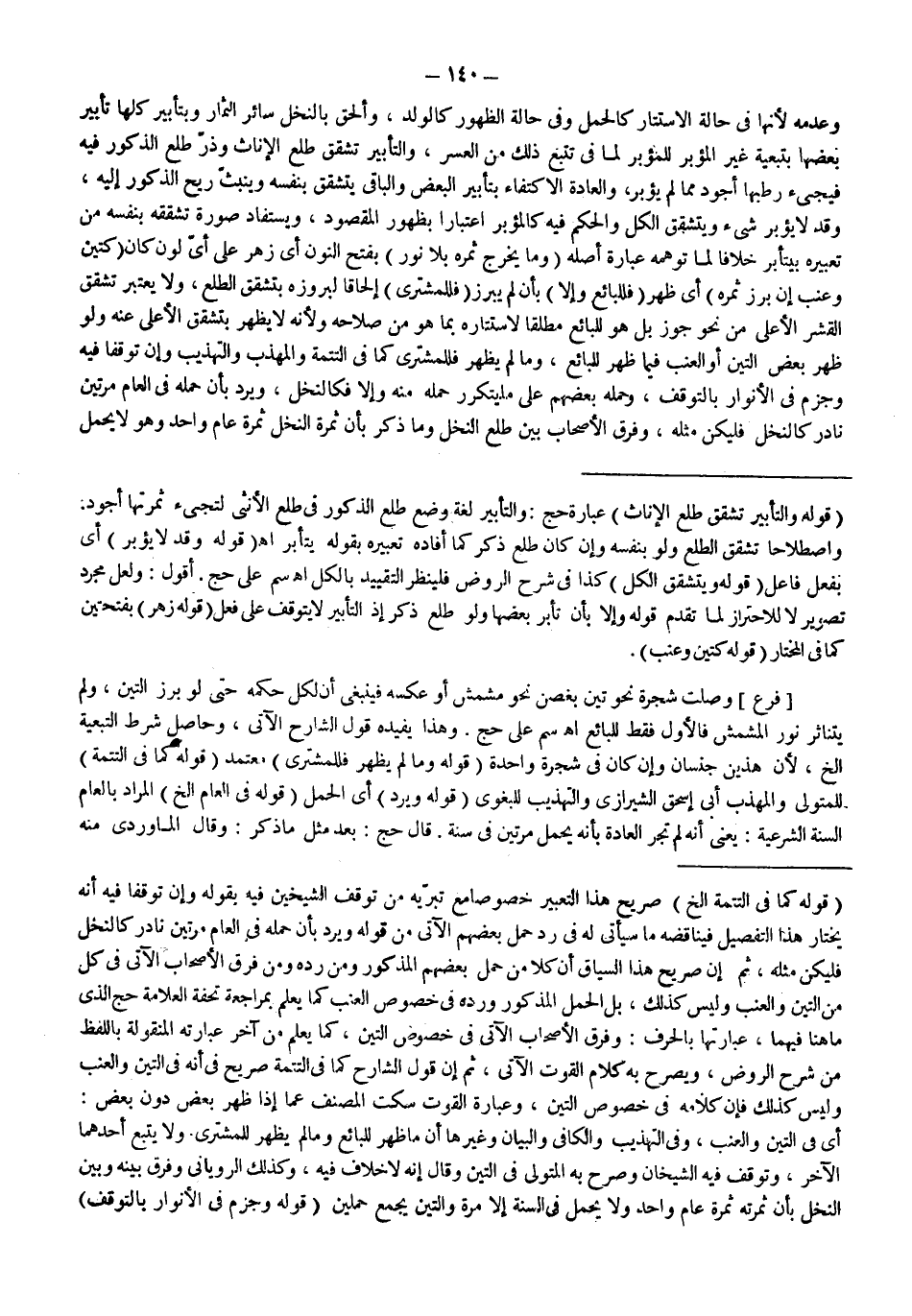 وَعَدَمِهِ لِأَنَّهَا فِي حَالَةِ الِاسْتِتَارِ كَالْحَمْلِ وَفِي حَالَةِ الظُّهُورِ كَالْوَلَدِ، وَأَلْحَقَ بِالنَّخْلِ سَائِرَ الثِّمَارِ وَبِتَأْبِيرِ كُلِّهَا تَأْبِيرَ بَعْضِهَا بِتَبَعِيَّةِ غَيْرِ الْمُؤَبَّرِ لِلْمُؤَبَّرِ لِمَا فِي تَتَبُّعِ ذَلِكَ مِنْ الْعُسْرِ، وَالتَّأْبِيرُ تَشَقُّقُ طَلْعِ الْإِنَاثِ وَذَرِّ طَلْعِ الذُّكُورِ فِيهِ فَيَجِيءُ رُطَبُهَا أَجْوَدَ مِمَّا لَمْ يُؤَبَّرْ، وَالْعَادَةُ الِاكْتِفَاءُ بِتَأْبِيرِ الْبَعْضِ وَالْبَاقِي يَتَشَقَّقُ بِنَفْسِهِ وَيَنْبَثُّ رِيحُ الذُّكُورِ إلَيْهِ، وَقَدْ لَا يُؤَبَّرُ شَيْءٌ وَيَتَشَقَّقُ الْكُلُّ وَالْحُكْمُ فِيهِ كَالْمُؤَبَّرِ اعْتِبَارًا بِظُهُورِ الْمَقْصُودِ، وَيُسْتَفَادُ صُورَةُ تَشَقُّقِهِ بِنَفْسِهِ مِنْ تَعْبِيرِهِ بِيَتَأَبَّرُ خِلَافًا لِمَا تُوهِمُهُ عِبَارَةُ أَصْلِهِ.
