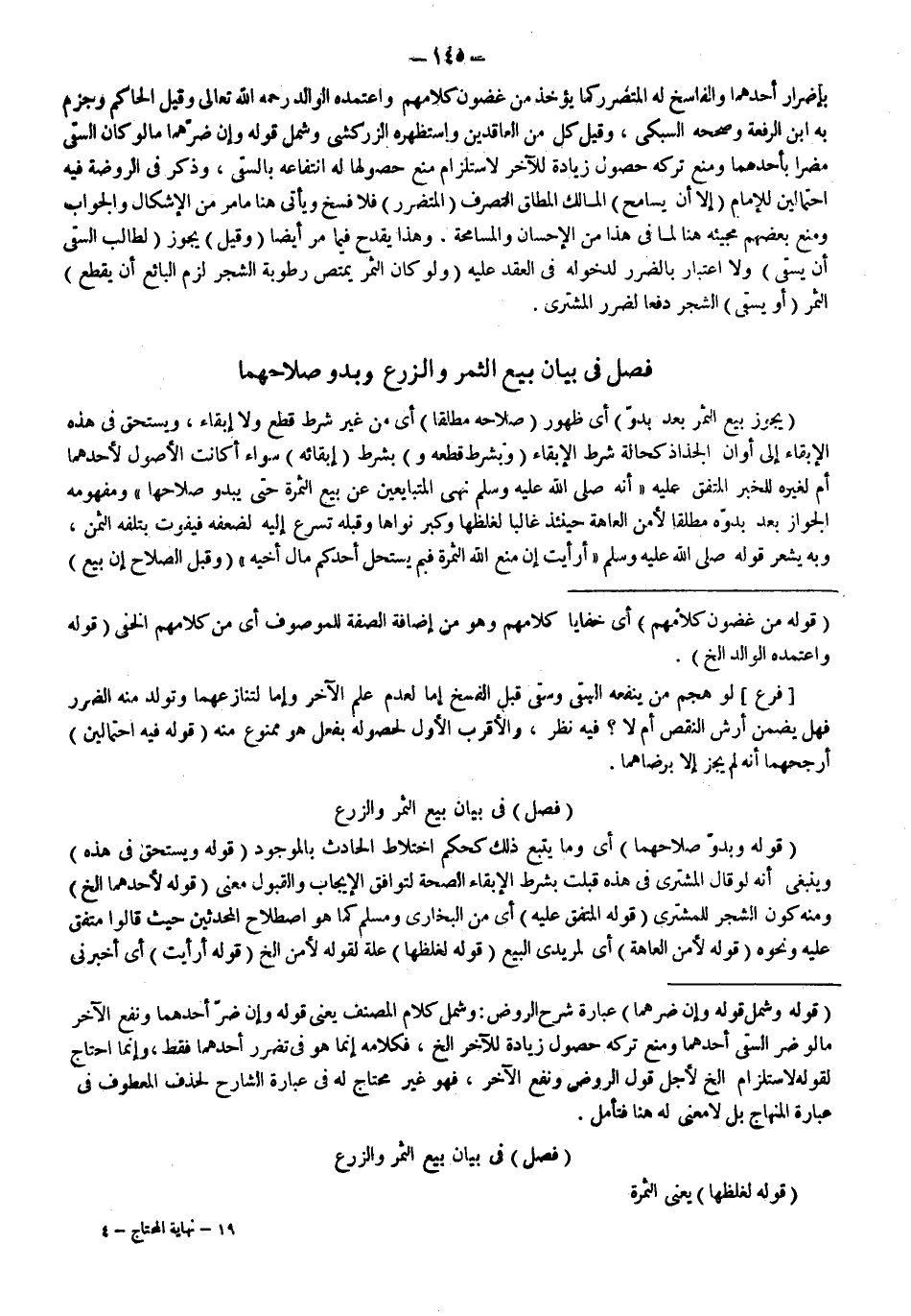 فَصْلٌ فِي بَيَانِ بَيْعِ الثَّمَرِ وَالزَّرْعِ وَبُدُوِّ صَلَاحِهِمَا (يَجُوزُ) (بَيْعُ الثَّمَرِ بَعْدَ بُدُوِّ) أَيْ ظُهُورِ (صَلَاحِهِ مُطْلَقًا) أَيْ مِنْ غَيْرِ شَرْطِ قَطْعٍ وَلَا إبْقَاءٍ، وَيَسْتَحِقُّ فِي هَذِهِ الْإِبْقَاءِ إلَى أَوَانِ الْجِذَاذِ كَحَالَةِ شَرْطِ الْإِبْقَاءِ (وَبِشَرْطِ قَطْعِهِ وَ) بِشَرْطِ (إبْقَائِهِ) سَوَاءٌ أَكَانَتْ الْأُصُولُ لِأَحَدِهِمَا أَمْ لِغَيْرِهِ لِلْخَبَرِ الْمُتَّفَقِ عَلَيْهِ «أَنَّهُ - صَلَّى اللَّهُ عَلَيْهِ وَسَلَّمَ - نَهَى الْمُتَبَايِعَيْنِ عَنْ بَيْعِ الثَّمَرَةِ حَتَّى يَبْدُوَ صَلَاحُهَا» وَمَفْهُومُهُ الْجَوَازُ بَعْدَ بُدُوِّهِ مُطْلَقًا لِأَمْنِ الْعَاهَةِ حِينَئِذٍ غَالِبًا لِغِلَظِهَا وَكِبَرِ نَوَاهَا وَقَبْلَهُ تَسَرُّعٌ إلَيْهِ لِضَعْفِهِ فَيَفُوتُ بِتَلَفِهِ الثَّمَنُ، وَبِهِ يُشْعِرُ قَوْلُهُ - صَلَّى اللَّهُ عَلَيْهِ وَسَلَّمَ - «أَرَأَيْت إنْ مَنَعَ اللَّهُ الثَّمَرَةَ فَبِمَ يَسْتَحِلُّ أَحَدُكُمْ مَالَ أَخِيهِ» (وَقَبْلَ الصَّلَاحِ إنْ) (بِيعَ)