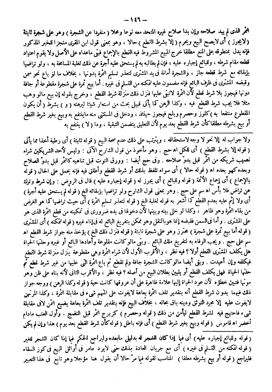 الثَّمَرُ الَّذِي لَمْ يَبْدُ صَلَاحُهُ وَإِنْ بَدَا صَلَاحُ غَيْرِهِ الْمُتَّحِدُ مَعَهُ نَوْعًا وَمَحَلًّا (مُنْفَرِدًا عَنْ الشَّجَرَةِ) وَهُوَ عَلَى شَجَرَةٍ ثَابِتَةٍ (لَا يَجُوزُ) أَيْ لَا يَصِحُّ الْبَيْعُ وَيَحْرُمُ (إلَّا بِشَرْطِ الْقَطْعِ) حَالًا، وَهُوَ بِمَعْنَى قَوْلِ ابْنِ الْمُقْرِي مُنْجِزًا لِلْخَبَرِ الْمَذْكُورِ فَإِنَّهُ يَدُلُّ بِمَنْطُوقِهِ عَلَى الْمَنْعِ مُطْلَقًا خَرَجَ الْمَبِيعُ الْمَشْرُوطُ فِيهِ الْقَطْعُ بِالْإِجْمَاعِ فَبَقِيَ مَا عَدَاهُ عَلَى الْأَصْلِ وَلَا يَقُومُ اعْتِيَادُ قَطْعِهِ مَقَامَ شَرْطِهِ، وَلِلْبَائِعِ إجْبَارُهُ عَلَيْهِ، فَإِنْ لَمْ يُطَالِبْهُ بِهِ لَمْ يَسْتَحِقَّ عَلَيْهِ أُجْرَةً مِنْ ذَلِكَ لِغَلَبَةِ الْمُسَامَحَةِ بِهِ، وَلَوْ تَرَاضَيَا بِإِبْقَائِهِ مَعَ شَرْطِ قَطْعِهِ جَازَ، وَالشَّجَرَةُ أَمَانَةٌ فِي يَدِ الْمُشْتَرِي لِتَعَذُّرِ تَسْلِيمِ الثَّمَرَةِ بِدُونِهَا، بِخِلَافِ مَا لَوْ بَاعَ نَحْوَ سَمْنٍ وَقَبَضَهُ الْمُشْتَرِي فِي ظَرْفِ الْبَائِعِ فَإِنَّهُ مَضْمُونٌ عَلَيْهِ لِتَمَكُّنِهِ مِنْ التَّسَلُّمِ فِي غَيْرِهِ.
