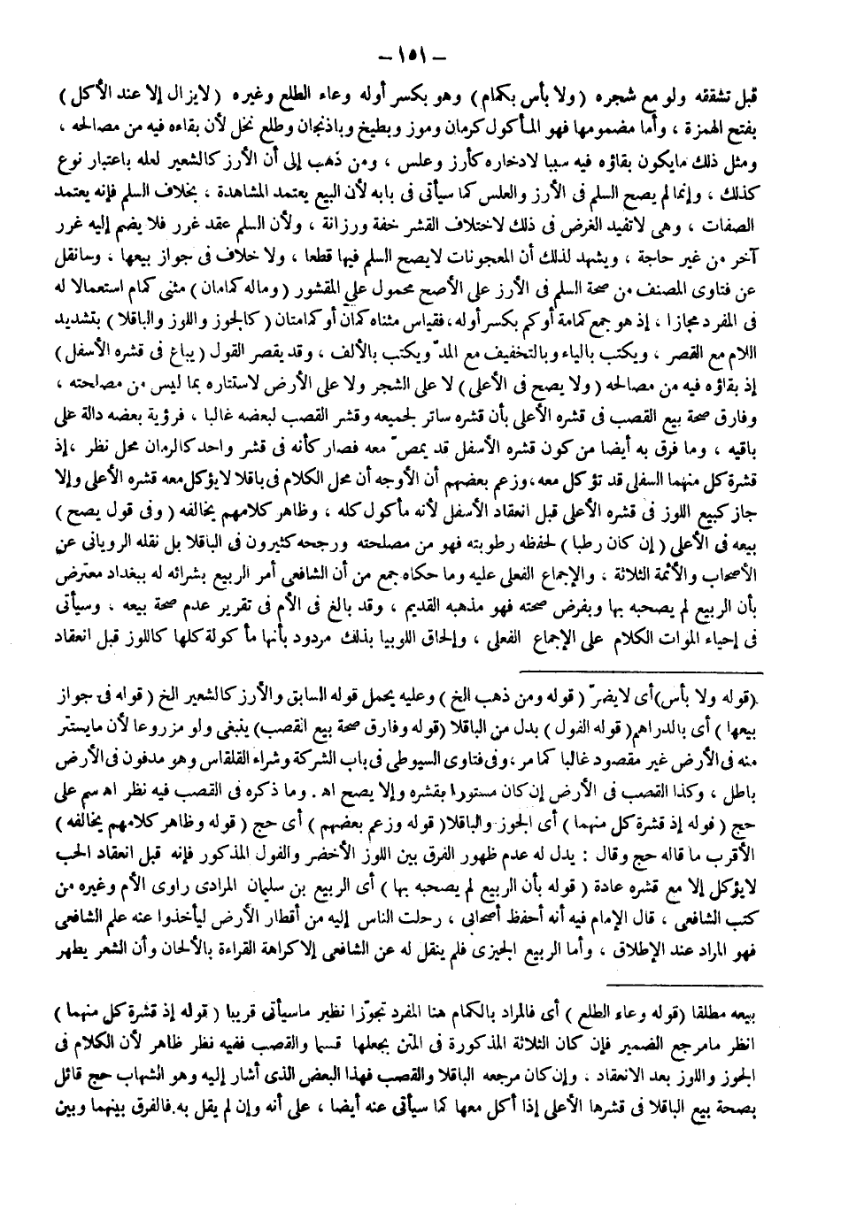 ـــــــــــــــــــــــــــــQبَيْعُهُ مُطْلَقًا. (قَوْلُهُ: وِعَاءِ الطَّلْعِ) أَيْ فَالْمُرَادُ بِالْكِمَامِ هُنَا الْمُفْرَدُ تَجَوُّزًا نَظِيرُ مَا سَيَأْتِي قَرِيبًا. (قَوْلُهُ: إذْ قِشْرَةُ كُلٍّ مِنْهُمَا) اُنْظُرْ مَا مَرْجِعُ الضَّمِيرِ فَإِنْ كَانَ الثَّلَاثَةَ الْمَذْكُورَةُ فِي الْمَتْنِ بِجَعْلِهَا قِسْمًا وَالْقَصَبَ فَفِيهِ نَظَرٌ ظَاهِرٌ؛ لِأَنَّ الْكَلَامَ فِي الْجَوْزِ وَاللَّوْزِ بَعْدَ الِانْعِقَادِ، وَإِنْ كَانَ مَرْجِعُهُ الْبَاقِلَّا وَالْقَصَبَ فَهَذَا الْبَعْضُ الَّذِي أَشَارَ إلَيْهِ وَهُوَ الشِّهَابُ حَجّ قَائِلٌ بِصِحَّةِ بَيْعِ الْبَاقِلَّا فِي قِشْرِهَا الْأَعْلَى إذَا أَكَلَ مَعَهَا كَمَا سَيَأْتِي عَنْهُ أَيْضًا، عَلَى أَنَّهُ وَإِنْ لَمْ يَقُلْ بِهِ فَالْفَرْقُ بَيْنَهُمَا وَبَيْنَ الْقَصَبِ ظَاهِرٌ