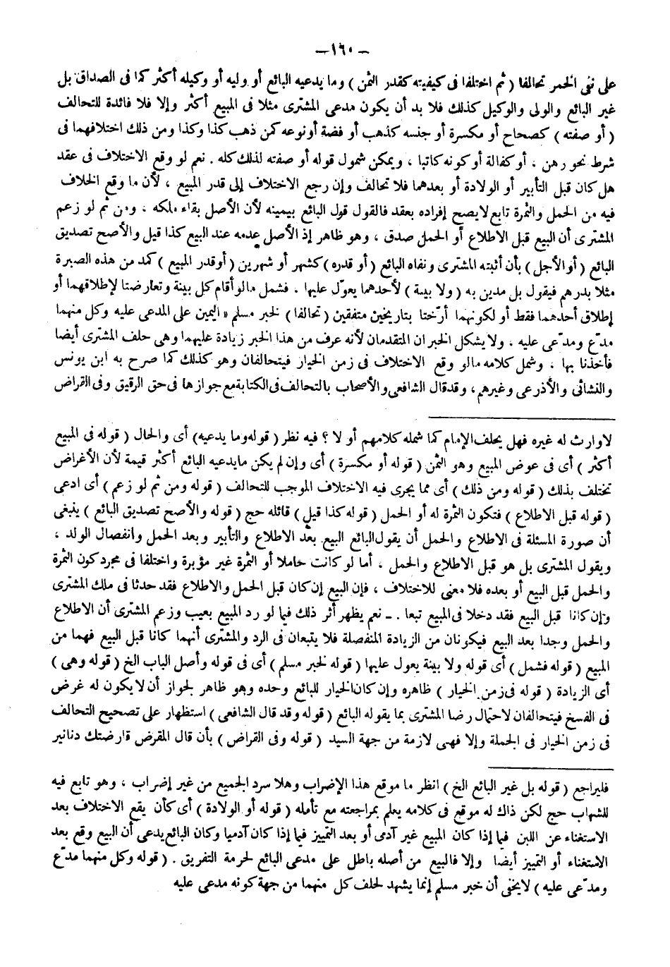 عَلَى نَفْيِ الْخَمْرِ تَحَالَفَا (ثُمَّ اخْتَلَفَا فِي كَيْفِيَّتِهِ كَقَدْرِ الثَّمَنِ) وَمَا يَدَّعِيهِ الْبَائِعُ. أَوْ وَلِيُّهُ أَوْ وَكِيلُهُ أَكْثَرُ كَمَا فِي الصَّدَاقِ بَلْ غَيْرُ الْبَائِعِ وَالْوَلِيِّ وَالْوَكِيلِ كَذَلِكَ فَلَا بُدَّ أَنْ يَكُونَ مُدَّعِي الْمُشْتَرِي مَثَلًا فِي الْمَبِيعِ أَكْثَرُ وَإِلَّا فَلَا فَائِدَةَ لِلتَّحَالُفِ (أَوْ صِفَتِهِ) كَصِحَاحٍ أَوْ مُكَسَّرَةٍ أَوْ جِنْسِهِ كَذَهَبٍ أَوْ فِضَّةٍ أَوْ نَوْعِهِ كَمِنْ ذَهَبِ كَذَا وَكَذَا وَمِنْ ذَلِكَ اخْتِلَافُهُمَا فِي شَرْطِ نَحْوِ رَهْنٍ، أَوْ كَفَالَةٍ أَوْ كَوْنِهِ كَاتِبًا، وَيُمْكِنُ شُمُولُ قَوْلِهِ أَوْ صِفَتِهِ لِذَلِكَ كُلِّهِ.