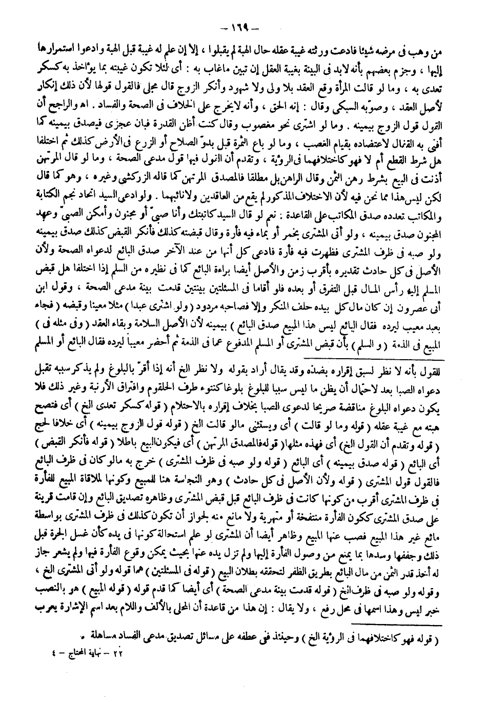 ـــــــــــــــــــــــــــــSلِلْقَوْلِ بِأَنَّهُ لَا نَظَرَ لِسَبْقِ إقْرَارِهِ بِضِدِّهِ وَقَدْ يُقَالُ أَرَادَ بِقَوْلِهِ وَلَا نَظَرَ إلَخْ أَنَّهُ إذَا أَقَرَّ بِالْبُلُوغِ وَلَمْ يَذْكُرْ سَبَبُهُ تُقْبَلُ دَعْوَاهُ الصِّبَا بَعْدُ لِاحْتِمَالِ أَنْ يَظُنَّ مَا لَيْسَ سَبَبًا لِلْبُلُوغِ بُلُوغًا كَنُتُوءِ طَرَفِ الْحُلْقُومِ وَافْتِرَاقِ الْأَرْنَبَةِ وَغَيْرِ ذَلِكَ فَلَا يَكُونُ دَعْوَاهُ الْبُلُوغَ مُنَاقَضَةً صَرِيحًا لِدَعْوَى الصِّبَا بِخِلَافِ إقْرَارِهِ بِالِاحْتِلَامِ (قَوْلُهُ: كَسُكْرٍ تَعَدَّى إلَخْ) أَيْ فَتَصِحُّ هِبَتُهُ مَعَ غَيْبَةِ عَقْلِهِ (قَوْلُهُ: وَمَا لَوْ قَالَتْ) أَيْ وَيُسْتَثْنَى مَا لَوْ قَالَتْ إلَخْ (قَوْلُهُ: قَوْلُ الزَّوْجِ بِيَمِينِهِ) أَيْ خِلَافًا لحج.