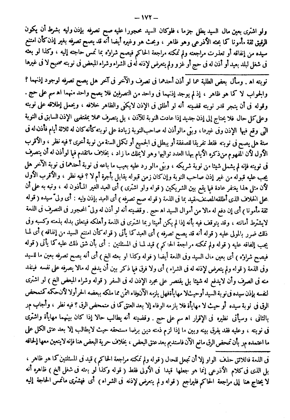 وَقَضِيَّتُهُ أَنَّهُ لَوْ أَذِنَ لَهُ وَلِيُّ الْمَحْجُورِ فِي التَّصَرُّفِ فِي الذِّمَّةِ لَا يُشْتَرَطُ أَمَانَتُهُ، وَقَدْ يُتَوَقَّفُ فِيهِ بِأَنَّهُ إذَا لَمْ يَكُنْ أَمِينًا رُبَّمَا اشْتَرَى فِي الذِّمَّةِ وَأَهْلَكَهُ فَيَتَعَلَّقُ بَدَلُهُ بِذِمَّتِهِ وَكَسْبِهِ وَفِي ذَلِكَ ضَرَرٌ بِالْمُوَلَّى عَلَيْهِ (قَوْلُهُ: أَنَّهُ قَدْ يَصِحُّ تَصَرُّفُهُ) أَيْ الْعَبْدِ كَمَا يَأْتِي (قَوْلُهُ: كَأَنْ امْتَنَعَ السَّيِّدُ مِنْ إنْفَاقِهِ) أَيْ لَمَّا يَجِبُ إنْفَاقُهُ عَلَيْهِ (قَوْلُهُ: وَلَمْ تُمْكِنْهُ مُرَاجَعَةُ الْحَاكِمِ) قَيْدٌ لِمَا فِي الْمَسْأَلَتَيْنِ: أَيْ بِأَنْ شَقَّ ذَلِكَ عَلَيْهِ كَمَا يَأْتِي (قَوْلُهُ: فَيَصِحُّ شِرَاؤُهُ) أَيْ بِعَيْنِ مَالِ السَّيِّدِ وَفِي الذِّمَّةِ أَيْضًا (قَوْلُهُ: وَكَذَا لَوْ بَعَثَهُ إلَخْ) أَيْ أَنَّهُ يَصِحُّ تَصَرُّفُهُ بِعَيْنِ مَا لِلسَّيِّدِ وَفِي الذِّمَّةِ (قَوْلُهُ: وَلَمْ يَتَعَرَّضْ لِإِذْنِهِ لَهُ فِي الشِّرَاءِ) أَيْ وَلَا فَرْقَ فِيمَا ذَكَرَ بَيْنَ أَنْ يَدْفَعَ لَهُ مَالًا يَصْرِفُهُ عَلَى نَفْسِهِ فَيَنْفُذُ مِنْهُ فِي الصَّرْفِ وَأَنْ لَا يَدْفَعَ لَهُ شَيْئًا بَلْ يَقْتَصِرُ عَلَى مُجَرَّدِ الْإِذْنِ لَهُ فِي السَّفَرِ (قَوْلُهُ: وَشِرَاءُ الْمُبَعَّضِ إلَخْ) لَوْ اشْتَرَى لِنَفْسِهِ بِإِذْنِ سَيِّدِهِ فِي نَوْبَةِ السَّيِّدِ أَوْ حَيْثُ لَا مُهَايَأَةَ فَهَلْ يَلْزَمُهُ الْآنَ وَفَاءُ الثَّمَنِ مِمَّا مَلَكَهُ بِبَعْضِهِ الْحُرِّ أَوْ لَا لِأَنَّ حُكْمَهُ كَمُتَمَحِّضِ الرِّقِّ فِي نَوْبَةِ سَيِّدِهِ أَوْ حَيْثُ لَا مُهَايَأَةَ فَلَا يَلْزَمُهُ الْوَفَاءُ إلَّا بَعْدَ الْعِتْقِ كَمَا فِي مُتَمَحِّضِ الرِّقِّ؟ فِيهِ نَظَرٌ، وَأَجَابَ مَرَّ بِالثَّانِي، وَسَيَأْتِي نَظِيرُهُ فِي الْإِقْرَارِ اهـ سم عَلَى حَجّ.