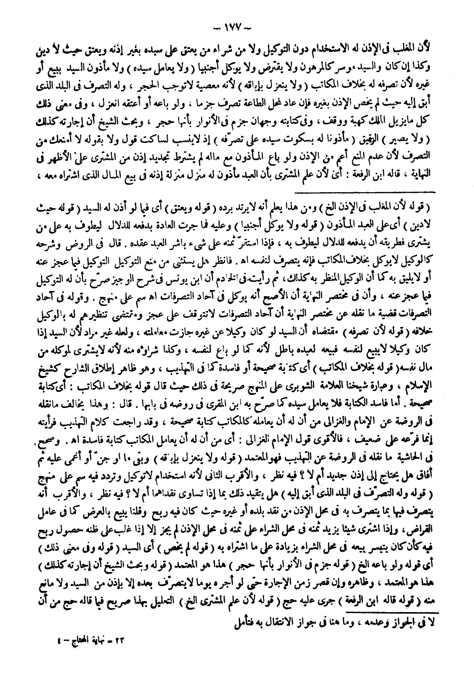 وَقَوْلُهُ: فِي آحَادِ التَّصَرُّفَاتِ قَضِيَّةُ مَا نَقَلَهُ عَنْ مُخْتَصَرِ النِّهَايَةِ أَنَّ آحَادَ التَّصَرُّفَاتِ لَا تَتَوَقَّفُ عَلَى عَجْزٍ وَمُقْتَضَى تَنْظِيرِهِمْ لَهُ بِالْوَكِيلِ خِلَافُهُ (قَوْلُهُ: لِأَنَّ تَصَرُّفَهُ) مُقْتَضَاهُ أَنَّ السَّيِّدَ لَوْ كَانَ وَكِيلًا عَنْ غَيْرِهِ جَازَتْ مُعَامَلَتُهُ، وَلَعَلَّهُ غَيْرُ مُرَادٍ لِأَنَّ السَّيِّدَ إذَا كَانَ وَكِيلًا لَا يَبِيعُ لِنَفْسِهِ فَبَيْعُهُ لِعَبْدِهِ بَاطِلٌ لِأَنَّهُ كَمَا لَوْ بَاعَ لِنَفْسِهِ، وَكَذَا شِرَاؤُهُ مِنْهُ لِأَنَّهُ لَا يَشْتَرِي لِمُوَكِّلِهِ مِنْ مَالِ نَفْسِهِ (قَوْلُهُ: بِخِلَافِ الْمُكَاتَبِ) أَيْ كِتَابَةً صَحِيحَةً أَوْ فَاسِدَةً كَمَا فِي التَّهْذِيبِ، وَهُوَ ظَاهِرُ إطْلَاقِ الشَّارِحِ كَشَيْخِ الْإِسْلَامِ، وَعِبَارَةُ شَيْخِنَا الْعَلَّامَةِ الشَّوْبَرِيِّ عَلَى الْمَنْهَجِ صَرِيحَةٌ فِي ذَلِكَ حَيْثُ قَالَ قَوْلُهُ: بِخِلَافِ الْمُكَاتَبِ: أَيْ كِتَابَةً صَحِيحَةً.