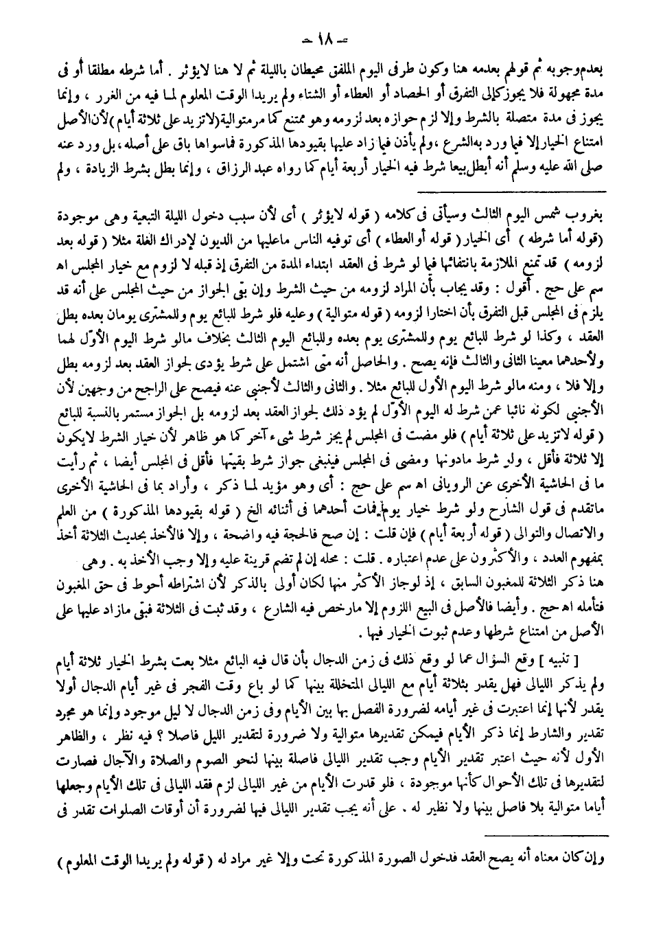 [تَنْبِيهٌ] وَقَعَ السُّؤَالُ عَمَّا لَوْ وَقَعَ ذَلِكَ فِي زَمَنِ الدَّجَّالِ بِأَنْ قَالَ فِيهِ الْبَائِعُ مَثَلًا بِعْت بِشَرْطِ الْخِيَارِ ثَلَاثَةِ أَيَّامٍ وَلَمْ يَذْكُرْ اللَّيَالِيَ فَهَلْ يُقَدَّرُ بِثَلَاثَةِ أَيَّامٍ مَعَ اللَّيَالِي الْمُتَخَلَّلَةِ بَيْنَهَا كَمَا لَوْ بَاعَ وَقْتَ الْفَجْرِ فِي غَيْرِ أَيَّامِ الدَّجَّالِ أَوْ لَا يُقَدِّرُ لِأَنَّهَا إنَّمَا اُعْتُبِرَتْ فِي غَيْرِ أَيَّامِهِ لِضَرُورَةِ الْفَصْلِ بِهَا بَيْنَ الْأَيَّامِ وَفِي زَمَنِ الدَّجَّالِ لَا لَيْلَ مَوْجُودٌ وَإِنَّمَا هُوَ مُجَرَّدُ تَقْدِيرٍ وَالشَّارِطُ إنَّمَا ذَكَرَ الْأَيَّامَ فَيُمْكِنُ تَقْدِيرُهَا مُتَوَالِيَةً وَلَا ضَرُورَةَ لِتَقْدِيرِ اللَّيْلِ فَاصِلًا؟ فِيهِ نَظَرٌ، وَالظَّاهِرُ الْأَوَّلُ لِأَنَّهُ حَيْثُ اُعْتُبِرَ تَقْدِيرُ الْأَيَّامِ وَجَبَ تَقْدِيرُ اللَّيَالِي فَاصِلَةً بَيْنَهُمَا لِنَحْوِ الصَّوْمِ وَالصَّلَاةِ وَالْآجَالِ فَصَارَتْ لِتَقْدِيرِهَا فِي تِلْكَ الْأَحْوَالِ كَأَنَّهَا مَوْجُودَةٌ، فَلَوْ قُدِّرَتْ الْأَيَّامُ مِنْ غَيْرِ اللَّيَالِي لَزِمَ فَقْدُ اللَّيَالِي فِي تِلْكَ الْأَيَّامِ وَجَعْلُهَا أَيَّامًا مُتَوَالِيَةً بِلَا فَاصِلٍ بَيْنَهُمَا وَلَا نَظِيرَ لَهُ، عَلَى أَنَّهُ يَجِبُ تَقْدِيرُ اللَّيَالِي فِيهَا لِضَرُورَةٍ أَنَّ أَوْقَاتَ الصَّلَوَاتِ تُقَدَّرُ فِي