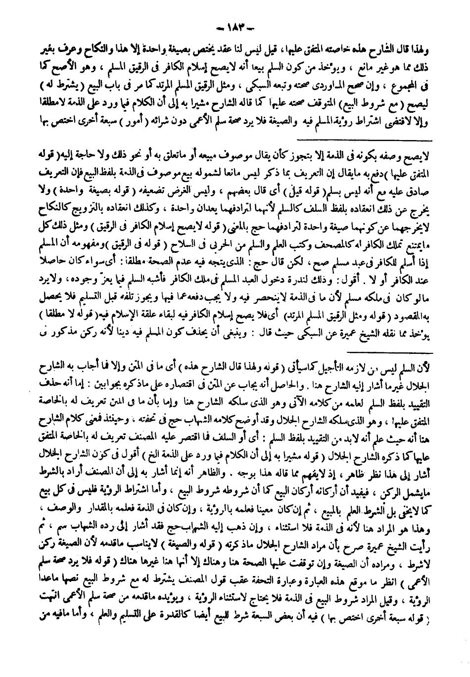 ـــــــــــــــــــــــــــــSلَا يَصِحُّ وَصْفُهُ بِكَوْنِهِ فِي الذِّمَّةِ إلَّا بِتَجَوُّزٍ كَأَنْ يُقَالُ مَوْصُوفُ مَبِيعِهِ أَوْ مَا تَعَلَّقَ بِهِ أَوْ نَحْوُ ذَلِكَ وَلَا حَاجَةَ إلَيْهِ (قَوْلُهُ: الْمُتَّفَقُ عَلَيْهَا) دَفَعَ بِهِ مَا يُقَالُ إنَّ التَّعْرِيفَ بِمَا ذُكِرَ لَيْسَ مَانِعًا لِشُمُولِهِ بَيْعَ مَوْصُوفٍ فِي الذِّمَّةِ بِلَفْظِ الْبَيْعِ فَإِنَّ التَّعْرِيفَ صَادِقٌ عَلَيْهِ مَعَ أَنَّهُ لَيْسَ بِسَلَمٍ (قَوْلُهُ: قِيلَ) أَيْ قَالَ بَعْضُهُمْ، وَلَيْسَ الْغَرَضُ تَضْعِيفُهُ (قَوْلُهُ: بِصِيغَةٍ وَاحِدَةٍ) وَلَا يَخْرُجُ عَنْ ذَلِكَ انْعِقَادُهُ بِلَفْظِ السَّلَفِ كَالسَّلَمِ لِأَنَّهُمَا لِتَرَادُفِهِمَا يُعَدَّانِ وَاحِدَةً، وَكَذَلِكَ انْعِقَادُهُ بِالتَّزْوِيجِ كَالنِّكَاحِ لَا يُخْرِجُهُمَا عَنْ كَوْنِهِمَا صِيغَةً وَاحِدَةً لِتَرَادُفِهِمَا حَجّ بِالْمَعْنَى (قَوْلُهُ: لَا يَصِحُّ إسْلَامُ الْكَافِرِ فِي الرَّقِيقِ) وَمِثْلُ ذَلِكَ كُلُّ مَا يَمْتَنِعُ تَمَلُّكُ الْكَافِرِ لَهُ كَالْمُصْحَفِ وَكُتُبِ الْعِلْمِ وَالسَّلَمِ مِنْ الْحَرْبِيِّ فِي السِّلَاحِ.