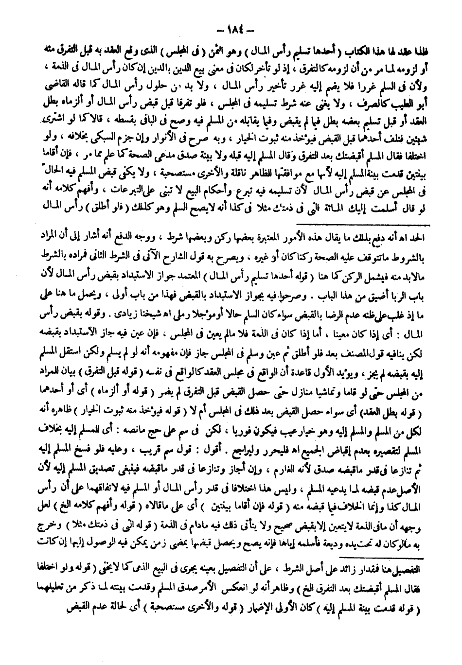 ـــــــــــــــــــــــــــــSالْحَدِّ اهـ أَنَّهُ دَفَعَ بِذَلِكَ مَا يُقَالُ هَذِهِ الْأُمُورُ الْمُعْتَبَرَةُ بَعْضُهَا رُكْنٌ وَبَعْضُهَا شَرْطٌ، وَوَجْهُ الدَّفْعِ أَنَّهُ أَشَارَ إلَى أَنَّ الْمُرَادَ بِالشُّرُوطِ مَا تَتَوَقَّفُ عَلَيْهِ الصِّحَّةُ رُكْنًا كَانَ أَوْ غَيْرَهُ، وَيُصَرِّحُ بِهِ قَوْلُ الشَّارِحِ الْآتِي فِي الشَّرْطِ الثَّانِي فَمُرَادُهُ بِالشَّرْطِ مَا لَا بُدَّ مِنْهُ فَيَشْمَلُ الرُّكْنَ كَمَا هُنَا (قَوْلُهُ: أَحَدُهَا تَسْلِيمُ رَأْسِ الْمَالِ) الْمُعْتَمَدُ جَوَازُ الِاسْتِبْدَادِ بِقَبْضِ رَأْسِ الْمَالِ لِأَنَّ بَابَ الرِّبَا أَضْيَقُ مِنْ هَذَا الْبَابِ.