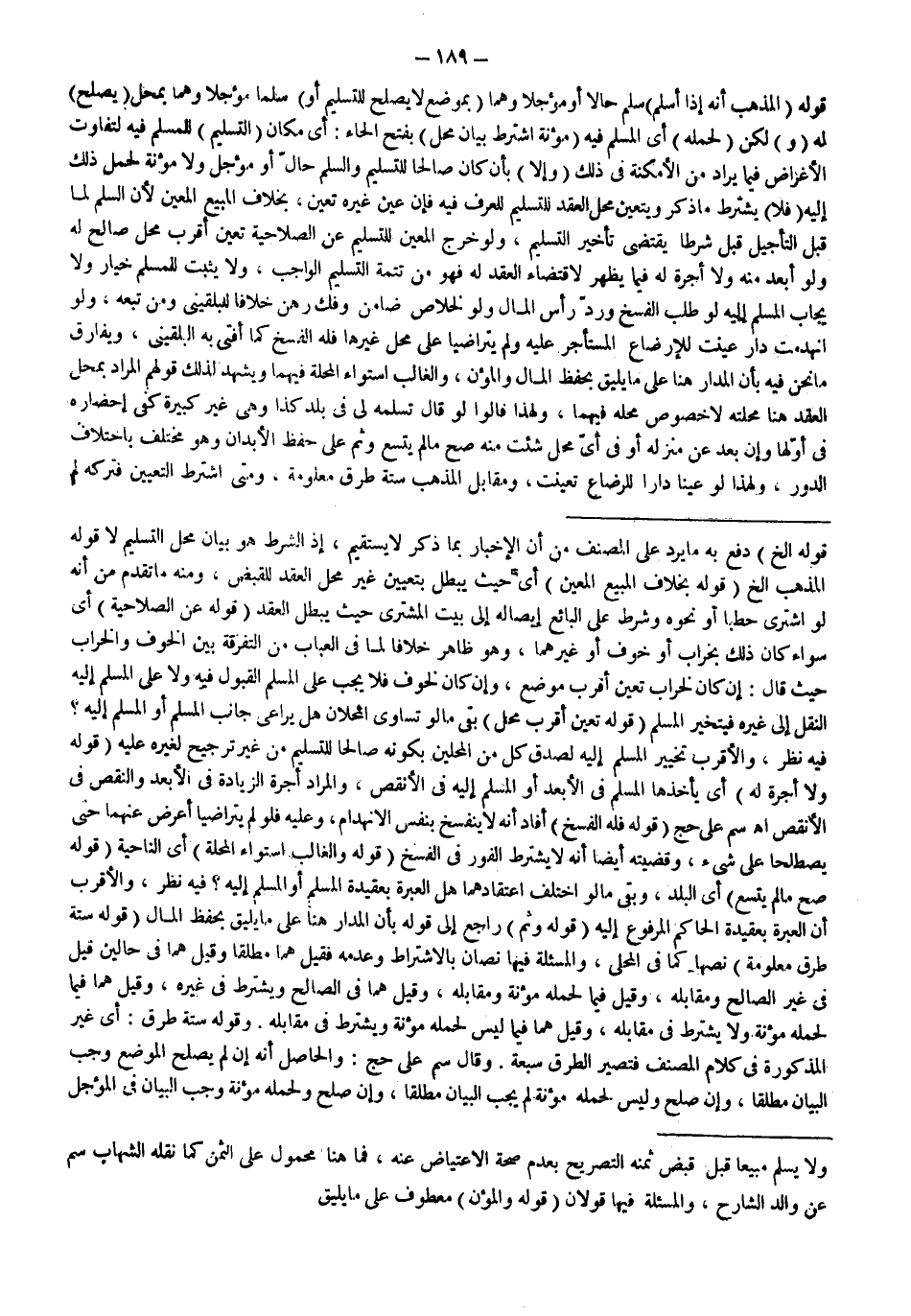 ـــــــــــــــــــــــــــــSقَوْلُهُ إلَخْ) دَفَعَ بِهِ مَا يَرُدُّ عَلَى الْمُصَنِّفِ مِنْ أَنَّ الْإِخْبَارَ بِمَا ذَكَرَ لَا يَسْتَقِيمُ، إذْ الشَّرْطُ هُوَ بَيَانُ مَحَلِّ التَّسْلِيمِ لَا قَوْلُهُ الْمَذْهَبُ إلَخْ (قَوْلُهُ: بِخِلَافِ الْمَبِيعِ الْمُعَيَّنِ) أَيْ حَيْثُ يَبْطُلُ بِتَعْيِينِ غَيْرِ مَحَلِّ الْعَقْدِ لِلْقَبْضِ، وَمِنْهُ مَا تَقَدَّمَ مِنْ أَنَّهُ لَوْ اشْتَرَى حَطَبًا أَوْ نَحْوَهُ وَشَرَطَ عَلَى الْبَائِعِ إيصَالَهُ إلَى بَيْتِ الْمُشْتَرِي حَيْثُ يَبْطُلُ الْعَقْدُ (قَوْلُهُ: عَنْ الصَّلَاحِيَّةِ) أَيْ سَوَاءٌ كَانَ ذَلِكَ بِخَرَابٍ أَوْ خَوْفٍ أَوْ غَيْرِهِمَا، وَهُوَ ظَاهِرٌ خِلَافًا لِمَا فِي الْعُبَابِ مِنْ التَّفْرِقَةِ بَيْنَ الْخَوْفِ وَالْخَرَابِ حَيْثُ قَالَ: إنْ كَانَ لِخَرَابٍ تَعَيَّنَ أَقْرَبُ مَوْضِعٍ، وَإِنْ كَانَ لِخَوْفٍ فَلَا يَجِبُ عَلَى الْمُسْلِمِ الْقَبُولُ فِيهِ وَلَا عَلَى الْمُسْلَمِ إلَيْهِ النَّقْلُ إلَى غَيْرِهِ فَيَتَخَيَّرُ الْمُسْلِمُ (قَوْلُهُ: تَعَيَّنَ أَقْرَبُ مَحَلٍّ) بَقِيَ مَا لَوْ تَسَاوَى الْمَحَلَّانِ هَلْ يُرَاعَى جَانِبُ الْمُسْلِمِ أَوْ الْمُسْلَمُ إلَيْهِ؟ فِيهِ نَظَرٌ، وَالْأَقْرَبُ تَخْيِيرُ الْمُسْلَمِ إلَيْهِ لِصِدْقِ كُلٍّ مِنْ الْمَحَلَّيْنِ بِكَوْنِهِ صَالِحًا لِلتَّسْلِيمِ مِنْ غَيْرِ تَرْجِيحٍ لِغَيْرِهِ عَلَيْهِ (قَوْلُهُ: وَلَا أُجْرَةَ لَهُ) أَيْ يَأْخُذُهَا الْمُسْلِمُ فِي الْأَبْعَدِ أَوْ الْمُسْلَمُ إلَيْهِ فِي الْأَنْقَصِ، وَالْمُرَادُ أُجْرَةُ الزِّيَادَةِ فِي الْأَبْعَدِ وَالنَّقْصِ فِي الْأَنْقَصِ اهـ سم عَلَى حَجّ (قَوْلُهُ: فَلَهُ الْفَسْخُ) أَفَادَ أَنَّهُ لَا يَنْفَسِخُ بِنَفْسِ الِانْهِدَامِ، وَعَلَيْهِ فَلَوْ لَمْ يَتَرَاضَيَا أَعْرَضَ عَنْهُمَا حَتَّى يَصْطَلِحَا عَلَى شَيْءٍ، وَقَضِيَّتُهُ أَيْضًا أَنَّهُ لَا يُشْتَرَطُ الْفَوْرُ فِي الْفَسْخِ (قَوْلُهُ: وَالْغَالِبُ اسْتِوَاءُ الْمَحَلَّةِ) أَيْ النَّاحِيَةِ (قَوْلُهُ: صَحَّ مَا لَمْ يَتَّسِعْ) أَيْ الْبَلَدُ، وَبَقِيَ مَا لَوْ اخْتَلَفَ اعْتِقَادُهُمَا هَلْ الْعِبْرَةُ بِعَقِيدَةِ الْمُسْلِمِ أَوْ الْمُسْلَمِ إلَيْهِ؟ فِيهِ نَظَرٌ، وَالْأَقْرَبُ أَنَّ الْعِبْرَةَ بِعَقِيدَةِ الْحَاكِمِ الْمَرْفُوعِ إلَيْهِ (قَوْلُهُ: وَثَمَّ) رَاجِعٌ إلَى قَوْلِهِ بِأَنَّ الْمَدَارَ هُنَا عَلَى مَا يَلِيقُ بِحِفْظِ الْمَالِ (قَوْلُهُ: سِتَّةُ طُرُقٍ مَعْلُومَةٍ) نَصُّهَا كَمَا فِي الْمَحَلِّيِّ، وَالْمَسْأَلَةُ فِيهَا نَصَّانِ بِالِاشْتِرَاطِ وَعَدَمِهِ فَقِيلَ هُمَا مُطْلَقًا وَقِيلَ هُمَا فِي حَالَيْنِ قِيلَ فِي غَيْرِ الصَّالِحِ وَمُقَابِلِهِ، وَقِيلَ فِيمَا لِحَمْلِهِ مُؤْنَةٌ وَمُقَابِلِهِ، وَقِيلَ هُمَا فِي الصَّالِحِ وَيُشْتَرَطُ فِي غَيْرِهِ، وَقِيلَ هُمَا فِيمَا لِحَمْلِهِ مُؤْنَةٌ وَلَا يُشْتَرَطُ فِي مُقَابِلِهِ، وَقِيلَ هُمَا فِيمَا لَيْسَ لِحَمْلِهِ مُؤْنَةٌ وَيُشْتَرَطُ فِي مُقَابِلِهِ.
